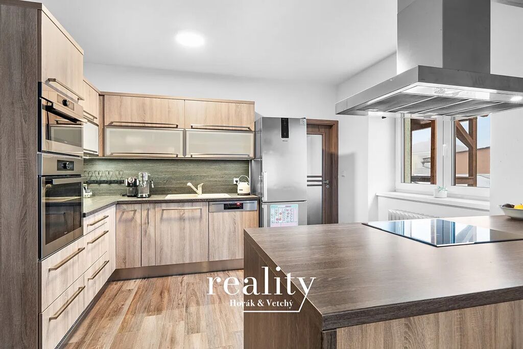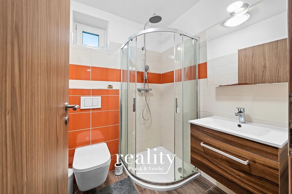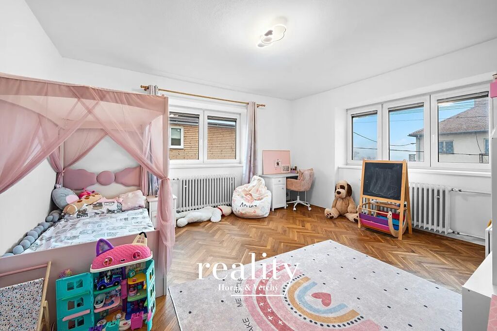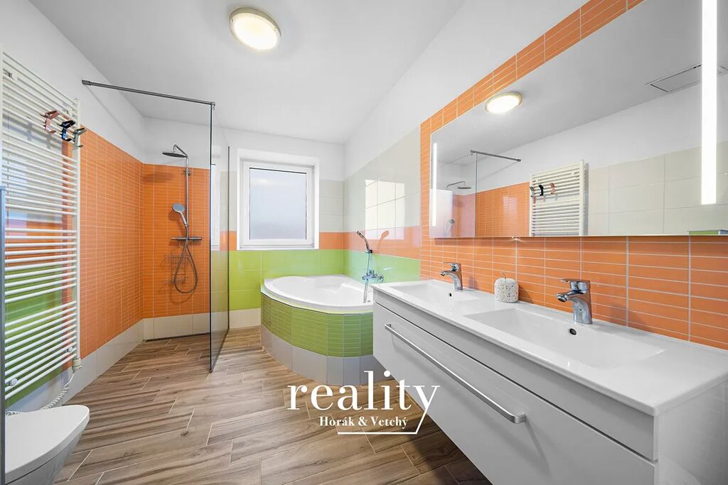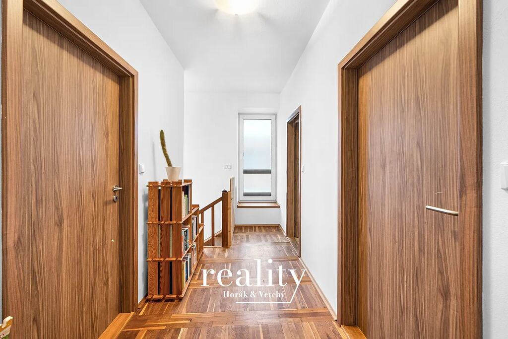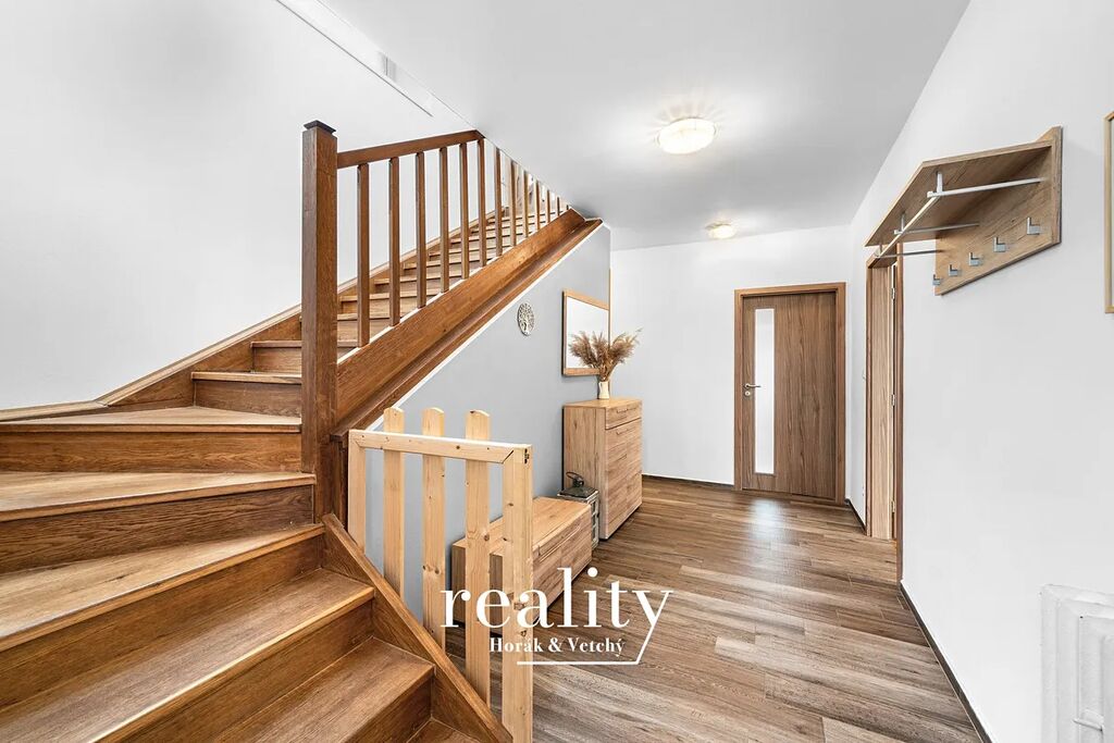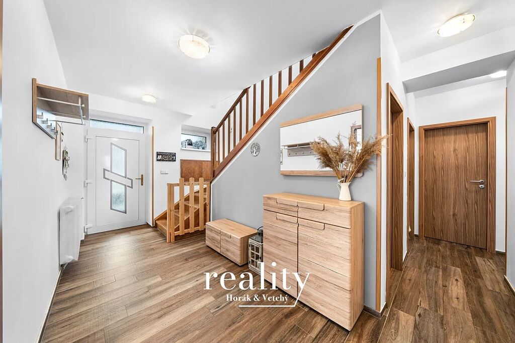 Ve spodním patře se nachází vstupní chodba se schodištěm, plně vybavená kuchyně a prostorný obývací pokoj. Dále je zde koupelna sprchovým koutem a toaletou. Součástí spodního patra je také prádelna a přímý vstup do garáže. V horním patře je umístěna koupelna s vanou i sprchovým koutem, ložnice se šatnou, dětský pokoj a pracovna, což nabízí dostatek prostoru i pro větší rodinu.