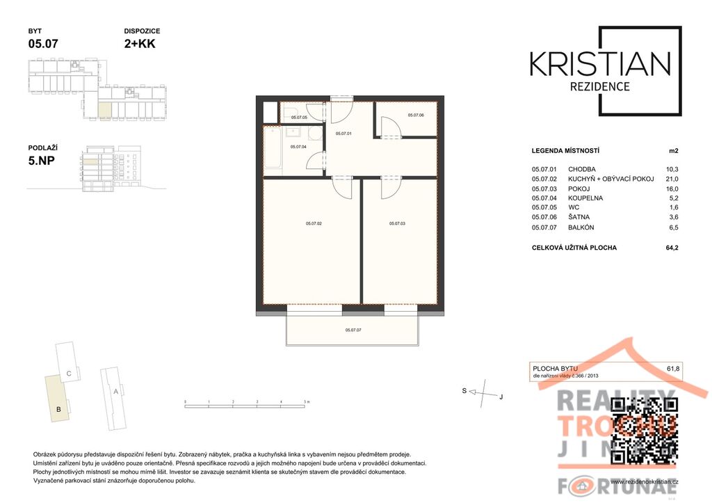 V novém developerském projektu Rezidence Kristian nabízíme prodej, moderního a nízkoenergetického bydlení v bytu 2+kk s balkónem a vnitřním parkovacím stáním ve vyhledávané lokalitě v Hradci Králové – Moravské Předměstí. Bytová jednotka se nachází v 5. NP zděného bytového domu, celková užitná plocha 64,2 m2, balkón 6,5 m2, šatna 3,6 m2. Dispozice: vstupní chodba, obývací pokoj s kuchyňským koutem, jídelnou, ložnicí, koupelna, WC, šatna. Vytápění: ústřední dálkové. K bytu náleží 1x vnitřní parkovací stání. Ve standardním provedení: plastová okna hranatá s izolačním trojsklem, vinylové podlahy KPP – výběr z 12 typů dekorů, koupelna s keramickou dlažbou La Ceramica Factory – výběr ze 4 dekorů, obklady Rako Systém, umyvadlo keramické se stojánkovou pákovou baterií, vana bílá akrylátová obdélníková. WC závěsné bílé. Použité materiály kombinují moderní technologie a udržitelnost a především snižují energetické náklady.