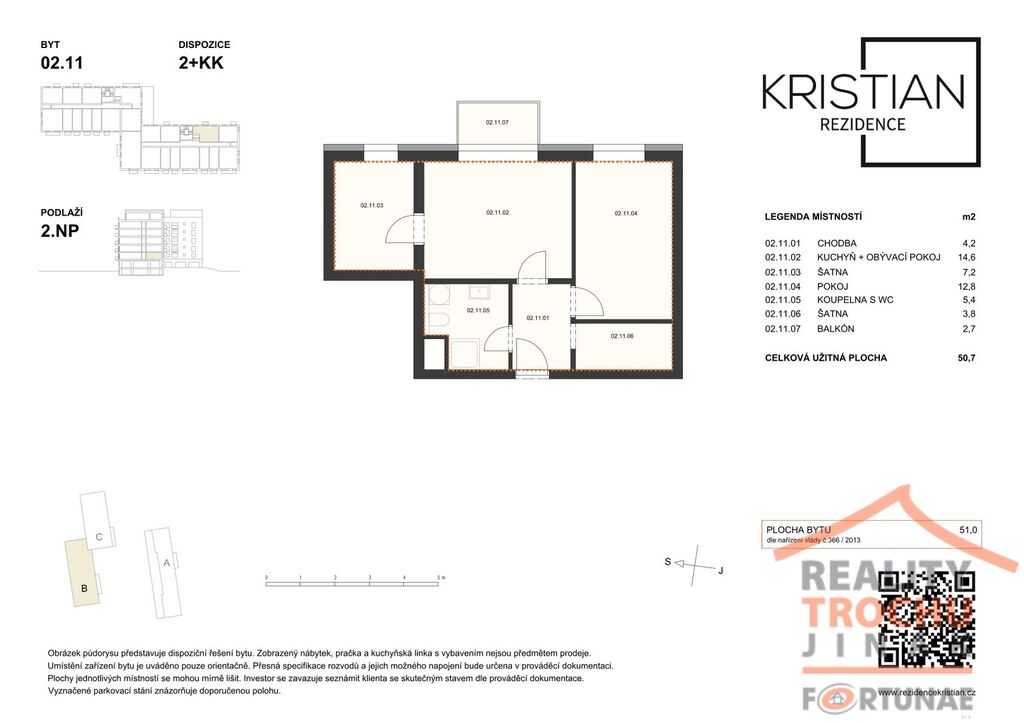 V novém developerském projektu Rezidence Kristian nabízíme prodej, moderního a nízkoenergetického bydlení v bytu 2+kk s balkónem ve vyhledávané lokalitě v Hradci Králové – Moravské Předměstí. Bytová jednotka se nachází ve 2. NP zděného bytového domu, celková užitná plocha 50,7 m2, balkón - 2,7 m2 a 2x šatna (7,2 m2, 3,8m2). K bytu náleží 1x vnitřní parkovací stání. Dispozice: vstupní chodba, obývací pokoj s kuchyňským koutem, jídelnou, ložnicí, koupelna s WC, 2x šatna. Vytápění: ústřední dálkové. Ve standardním provedení: plastová okna hranatá s izolačním trojsklem, vinylové podlahy KPP – výběr z 12 typů dekorů, koupelna s keramickou dlažbou La Ceramica Factory – výběr ze 4 dekorů, obklady Rako Systém, umyvadlo keramické se stojánkovou pákovou baterií, vana bílá akrylátová obdélníková. WC závěsné bílé. Použité materiály kombinují moderní technologie a udržitelnost a především snižují energetické náklady.