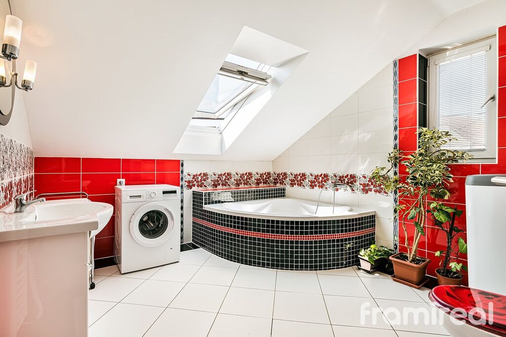 V patře jsou umístěny tři prostorné pokoje, koupelna s rohovou vanou a toaletou a pochozí půda vhodná pro úložné účely. Vytápění v patře je řešeno radiátory.