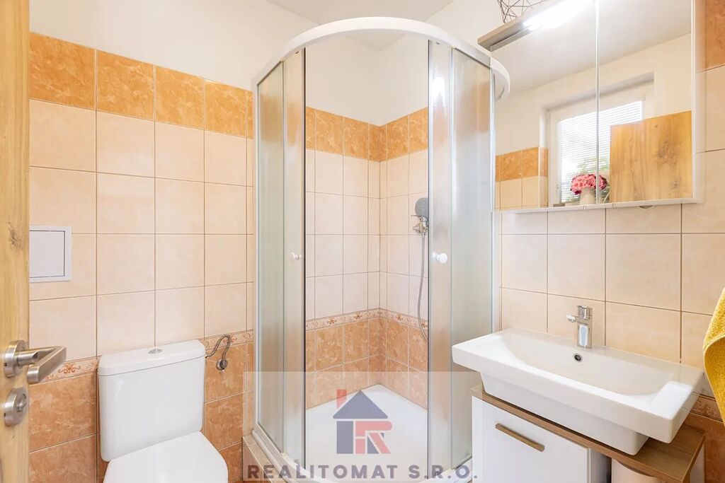 1. nadzemní podlaží: Zádveří s vestavěnou skříní, koupelna se sprchovým koutem a WC, kuchyňský kout vybavený vestavnými spotřebiči, obývací pokoj s přímým vstupem na terasu do udržované zahrady o velikosti 453 m2. Na pozemku se nachází vydlážděné venkovní parkovací stání pro další 2 auta, celkem 36 m2.