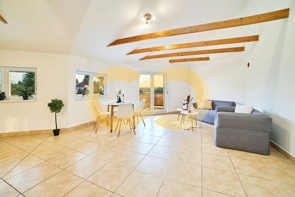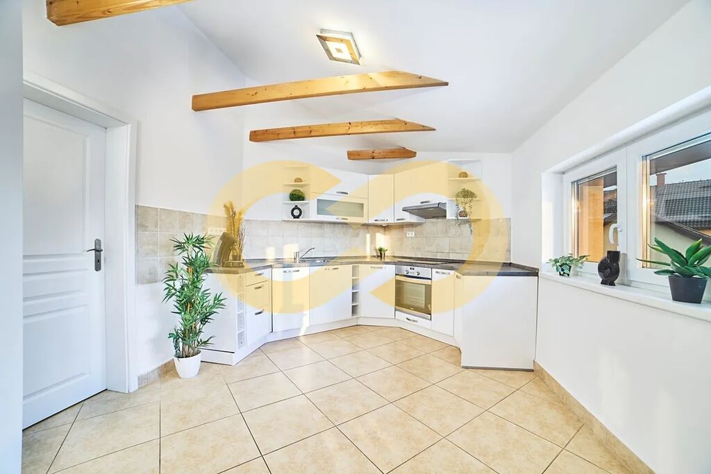 Ve druhém bytě s dispozicí 3+kk je obývací pokoj s kuchyní, spíží a 2 ložnicemi. Na první pohled vás okouzlí vysoké stropy, přiznané trámy… a hlavně balkon s výhledem do zahrady. Koupelna má vanu, toaletu i bidet a hned vedle ní je místnost, ze které by byla skvělá sauna.