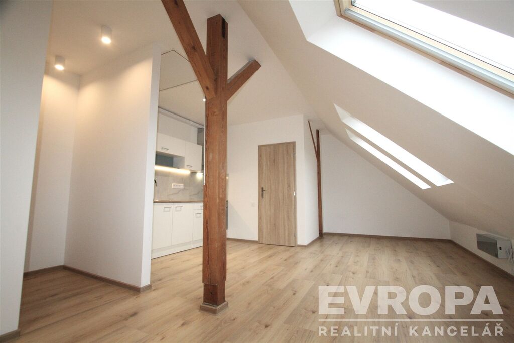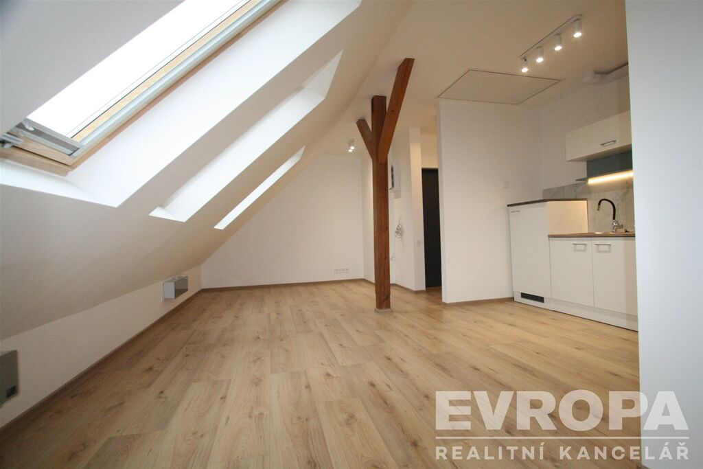 Nabízíme k pronájmu kompletně zrekonstruovaný byt dispozice 1+kk, plocha 33m2, nachází se v 5 podlaží cihlového domu. Byt je velmi atypický, jedná s o rekonstrukci půdního prostoru, vstup bezpečnostními dveřmi do prostorného obývacího prostoru, který je zónově rozdělený do části obývací, jídelní s kuchyňským koutem a prostorem pro spaní. Nová kuchyňská linka je vybavená skl. varnou deskou, el. troubou, menší lednicí s mrazákem a digestoří. Krásná zrekonstruovaná koupelna se sprchovým koutem, toaletou a místem na pračku. Ohřev vody pomocí el. bojleru, topení jsou nové el. přímotopy. Výhodou bytu je vlastní úložný půdní nebytový půdní prostor cca + 8m2 (neuvedeno v celkové výměře), do kterého je přístup po úzkém skládacím žebříku a slouží pro uskladnění sezónních věcí apod. Byt je velmi světlý, nová dřevěná střešní okna přes celou plochu obývacího prostoru zajišťují dostatek denního světla (jsou vybavena roletami), na podlahách plovoucí podlaha, dlažba, nové štuky, elektro a vodoinstalace. Možnost připojení internetu pouze od společnosti UPC (Vodafone). Perfektní spojení do centra Prahy, tramvajová zastávka Strážní, 300 metrů od domu, v místě skvělá občanská vybavenost, obchody, večerka, restaurace. Majitel domu preferuje pracujícího nájemce bez domácích zvířat, ideálně jednu osobu, s čistým trestním rejstříkem a bez exekucí. K nastěhování volný ihned. Prohlídky po dohodě s makléřem. Z důvodu absence PENB uvidíme třídu G.
