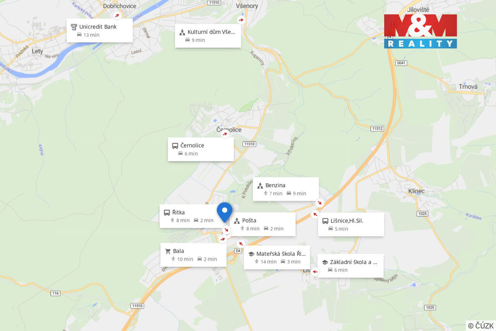 Dostupnost Prahy zajišťují autobusové spoje integrované dopravy s dojezdem na Smíchovské nádraží za 25 minut. BUS zastávka do 10 minut chůze.