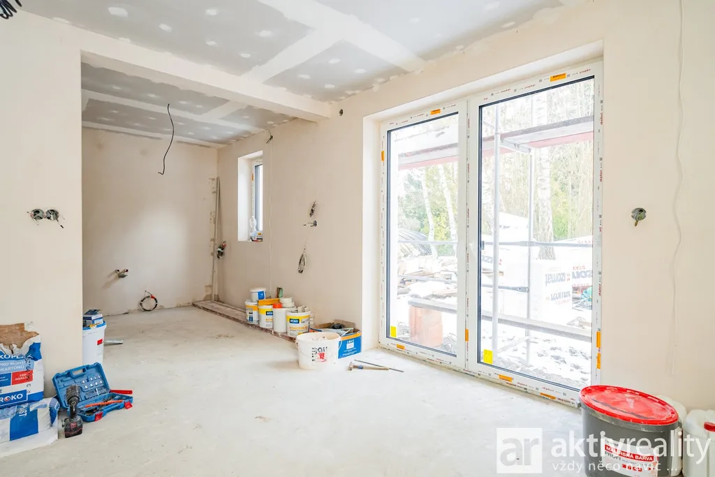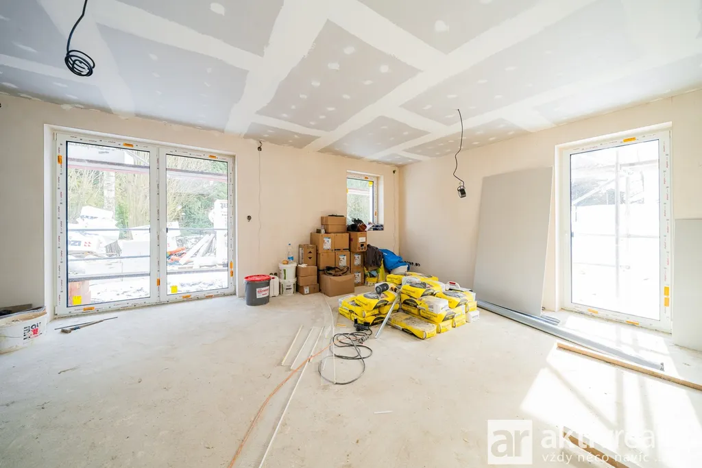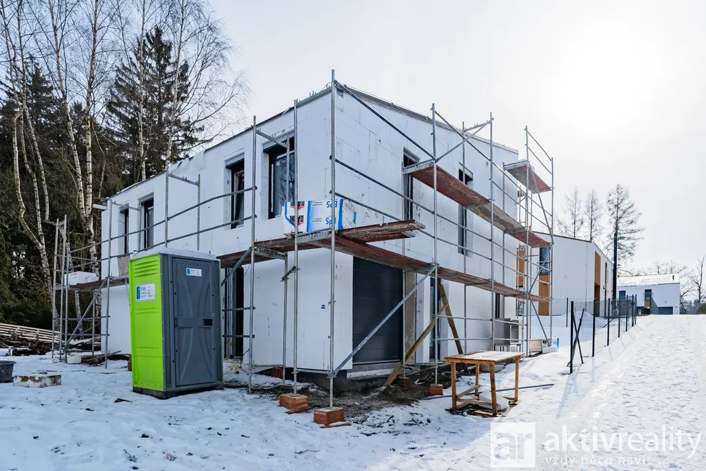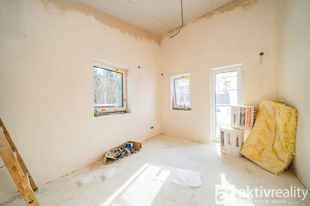 Dům je vybaven moderním tepelným čerpadlem vzduch–voda napojeným na podlahové vytápění v celém domě, což zajišťuje stabilní teplotní komfort a nízké provozní náklady. Plastová okna s izolačními trojskly doplňuje venkovní stínění na elektrický pohon. Koupelny jsou řešeny v nadčasovém stylu a vybavené kvalitní sanitou Hansgrohe a Laufen. Součástí domu je také příprava na krbová kamna včetně komínu, což budoucím majitelům umožňuje doplnit interiér o další prvek tepelné pohody. Podlahy v domě byly zvoleny s důrazem na kvalitu i estetiku – celé přízemí je provedeno ve velkoformátové dlažbě 120×120 cm v dekoru mramoru, která dodává prostoru moderní vzhled a je zároveň praktická pro rodinný provoz. Schodiště a celé horní podlaží jsou osazeny vinylovou podlahou v dekoru přírodního dubu, která přináší příjemně teplý charakter a vizuální kontinuitu interiéru.