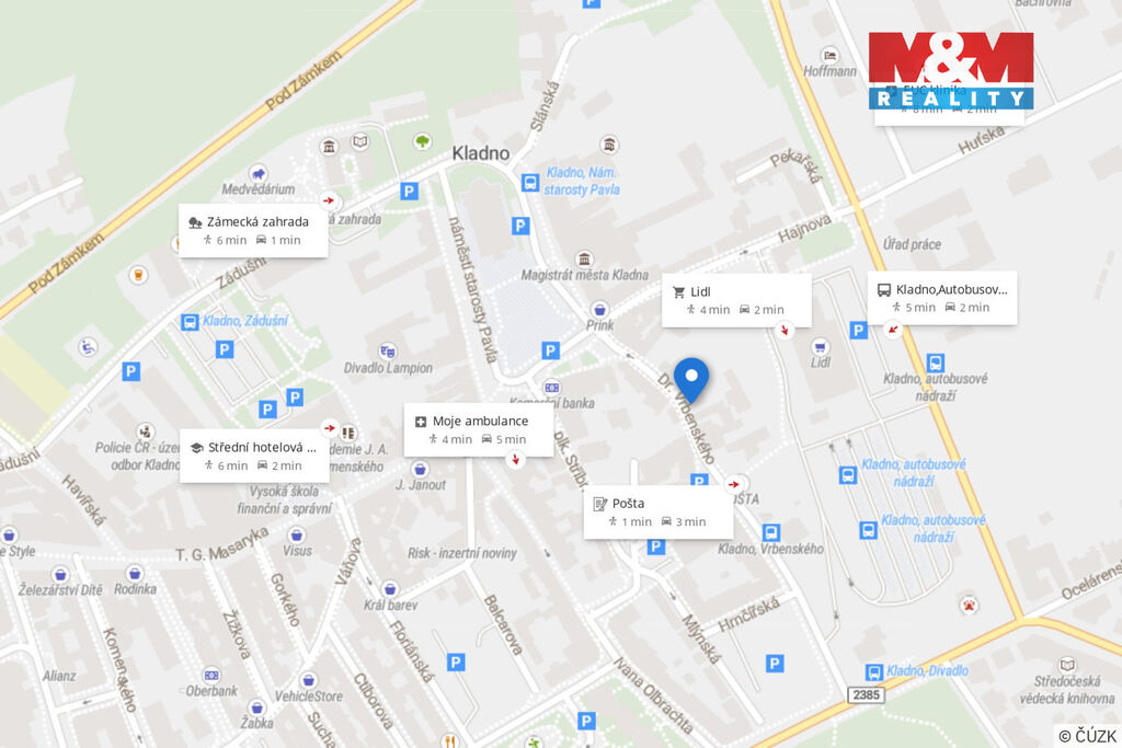 Tato nemovitost se nachází v centru Kladna pár kroků od historického náměstí s radnicí. V okolí se nahází restaurace, obchody, pošta, autobusové nádraží a služby.