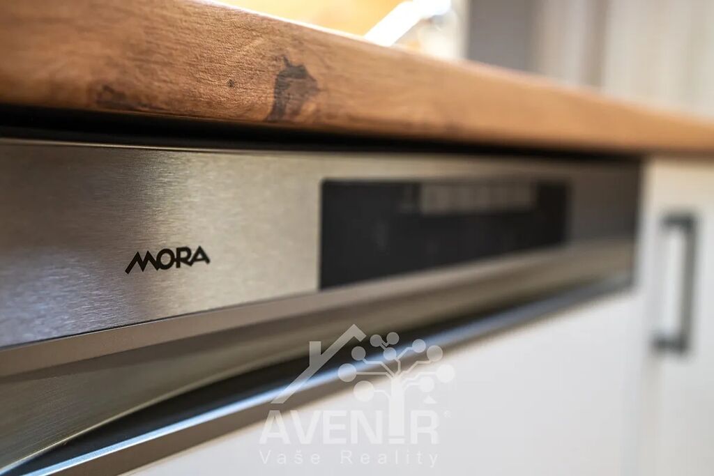V kuchyni je kompletní sada spotřebičů značky Mora: vestavěná lednice s mrazákem, vestavěná elektrická trouba, elektrická varná deska, digestoř a myčka nádobí.