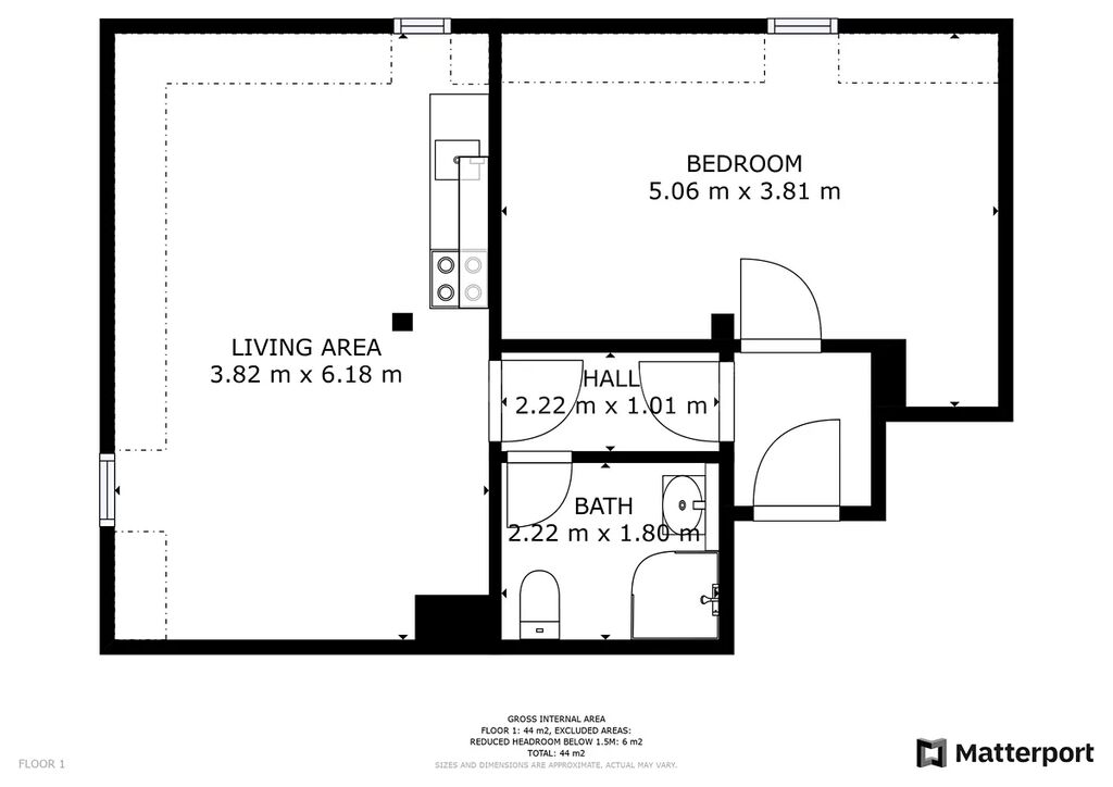 Dispozice 2+kk s celkovou podlahovou plochou 44 m².