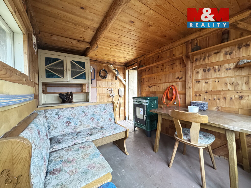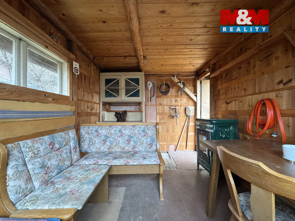 Na pozemku se nachází dřevěná chatka vybavená novými kamny, vhodná pro sezónní pobyt i uskladnění zahradního nářadí. K dispozici je vodovodní přípojka využitelná během sezóny od jara do podzimu.