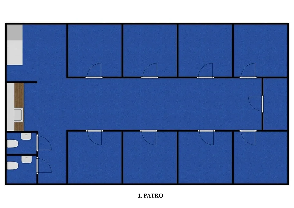 Po schodišti vejdeme do patra, kde nás přivítá vstupní hala o výměře cca 17,79m2, s kuchyní, dvěma WC (ideálně rozdělit na dámské a pánské), 8 samostatnými kancelářemi s klimatizací a skladem.
