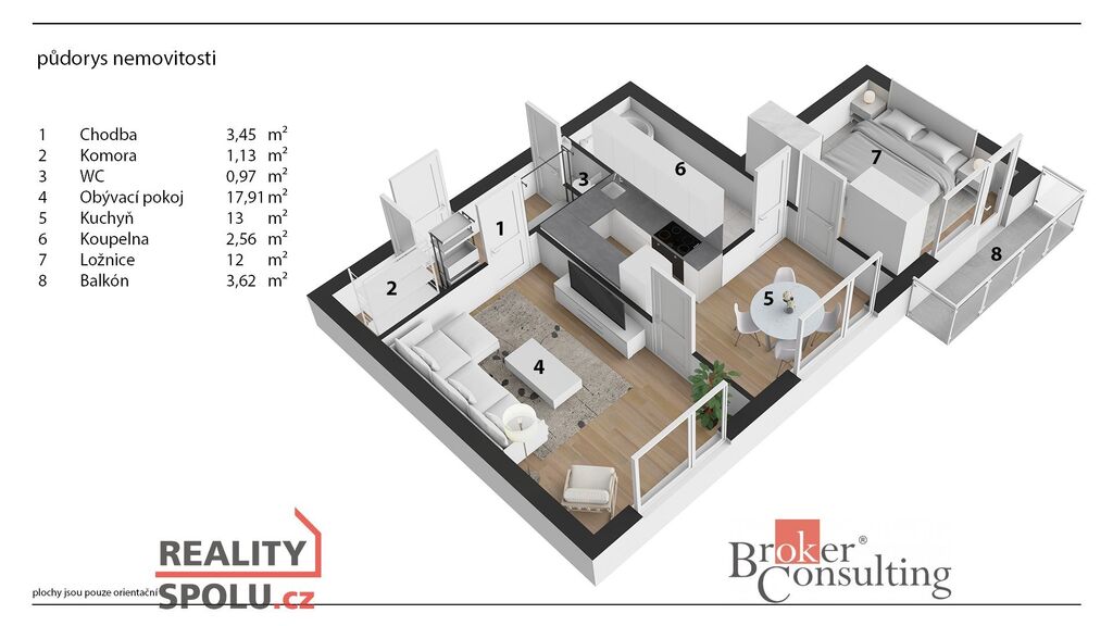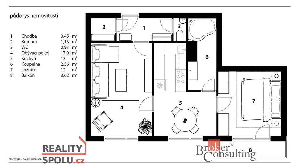 Byt je v udržovaném stavu a umožňuje okamžité nastěhování bez nutnosti větších investic. Dispozici tvoří obývací pokoj, jídelna s kuchyňským koutem, ložnice se vstupem na zasklenou lodžii, koupelna s vanou, samostatné WC a chodba s šatnou.