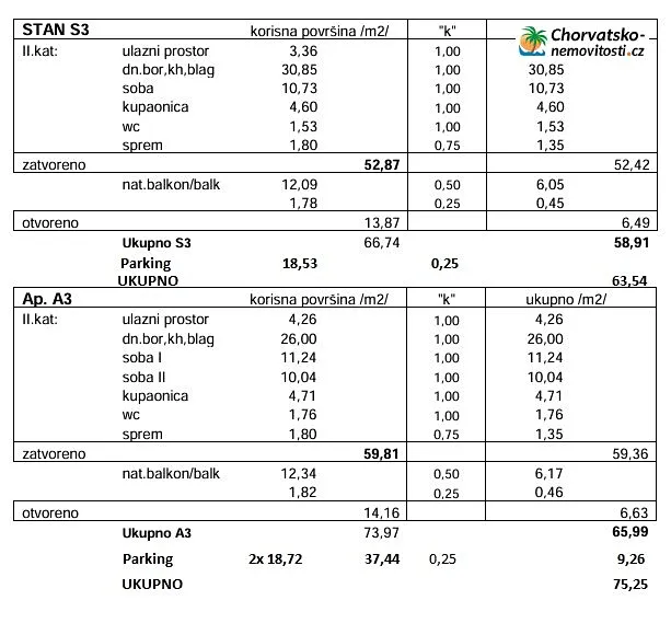 Na prodej třípokojový byt (A3) o celkové ploše 75,25 m2 ve druhém patře novostavby v Novalji