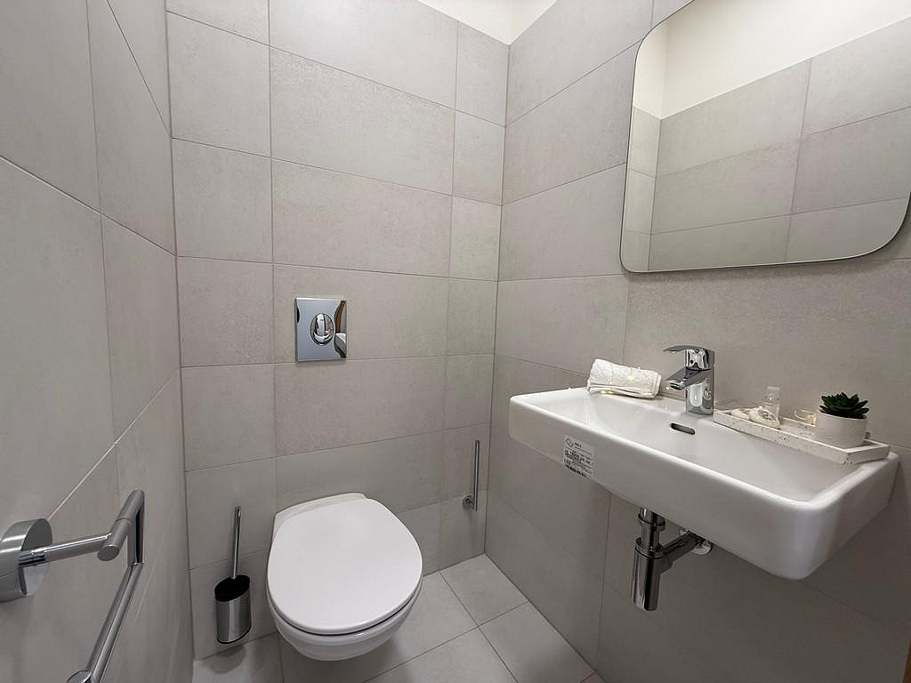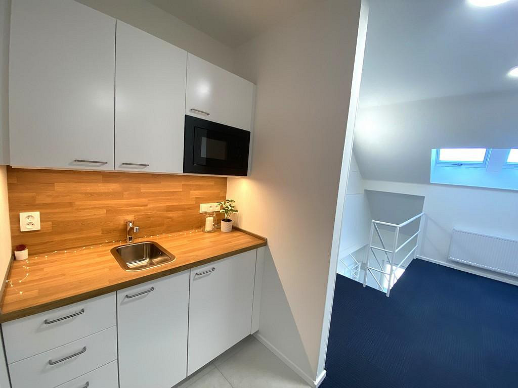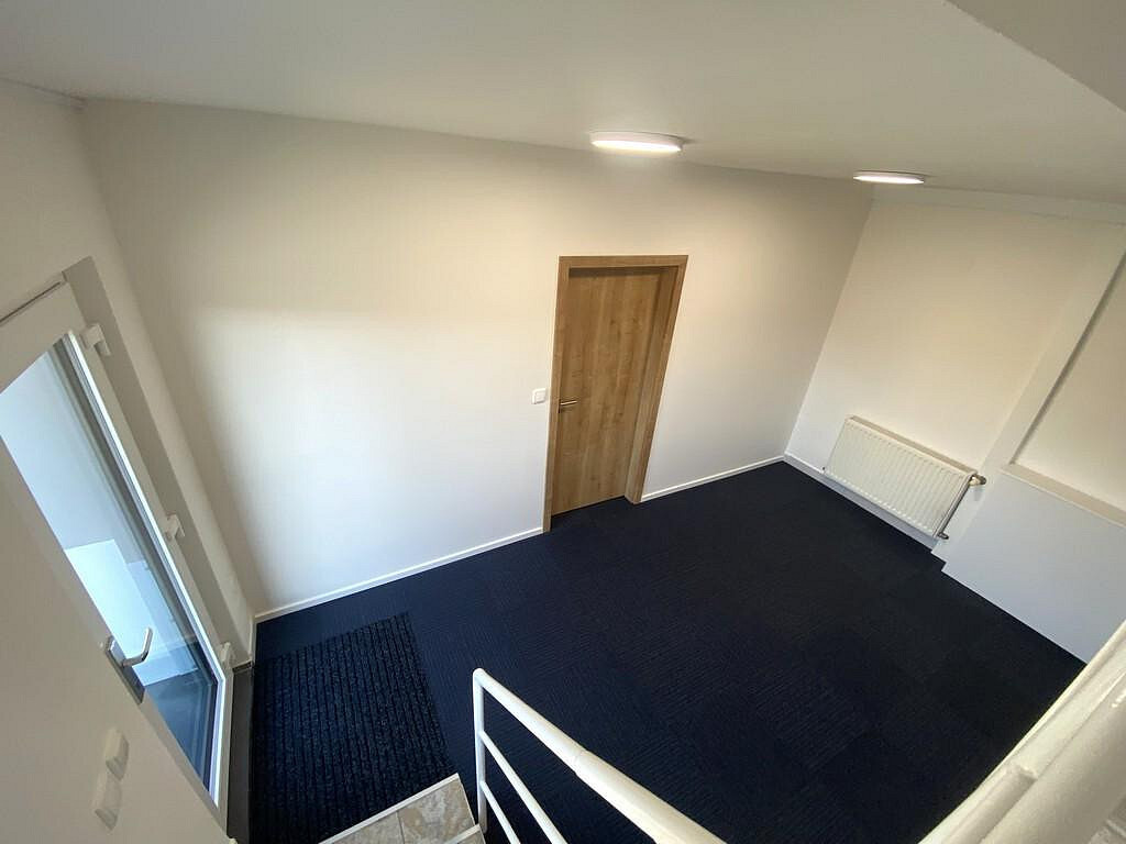 Ve vstupní hale je ideální místo pro sedačku s konferenčním místem, ale může tam také sedět například recepční či zde může být umístěn sekretariát. Kuchyňka o výměře cca 1,60m² je vybavena lednicí, mikrovlnnou troubou a spoustou úložného prostoru. WC jsou samostatné, každé vždy s umyvadlem o výměře cca 1,26m² a cca 2,11m². Chodba vedoucí do jednotlivých místností má výměru cca 23,70m². Kanceláře jsou samostatné, celkem je jich osm. Každá je vybavena klimatizací značky Sinclair, která chladí i topí. Místnosti jsou poměrně veliké a jejich výměra činí cca 12,94m², cca 12,84m², cca 12,76m², cca 11,70m², cca 14,90m², cca 11,06m² a 2x 12,08m². Na konci chodby je samostatná místnost o výměře cca 3,10m², která může sloužit jako úklidová místnost, archiv, ale i jako serverovna.