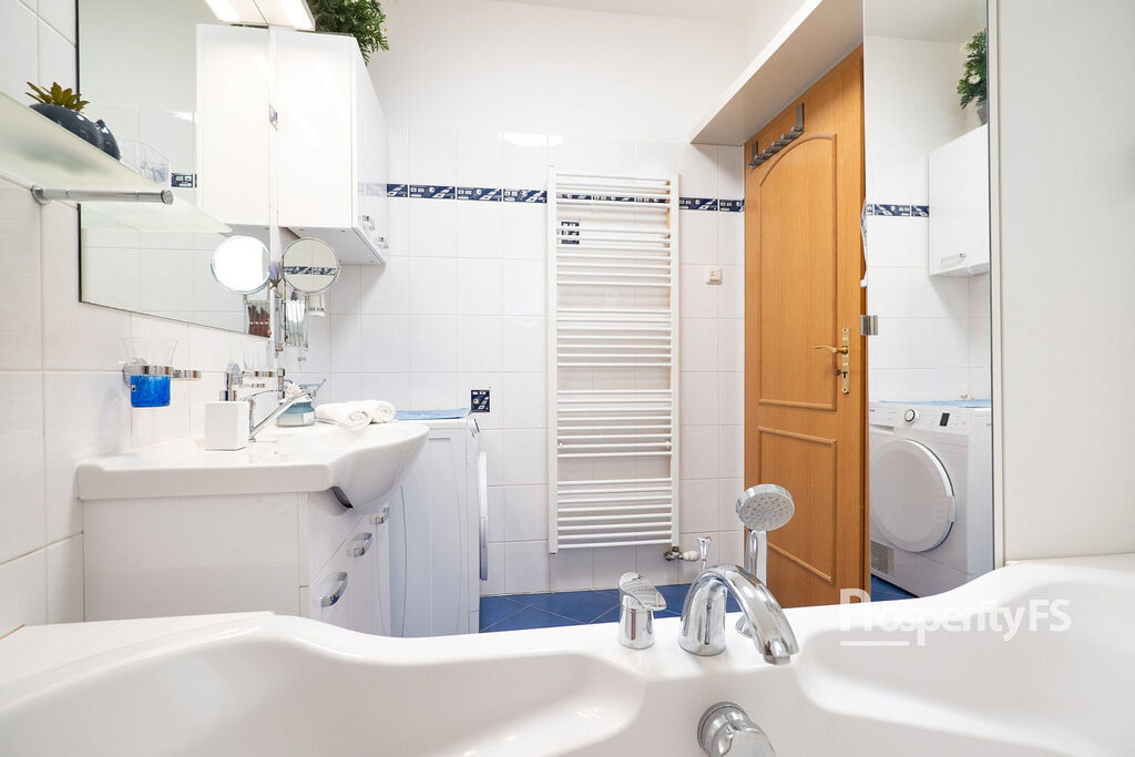 • Součástí bytu je zakázková kuchyňská linka s vestavěnými spotřebiči a dostatek úložného prostoru díky vestavěným skříním (dvě v ložnici a jedna v chodbě); další vybavení – pračka, skříňky, botník – je možné po domluvě ponechat