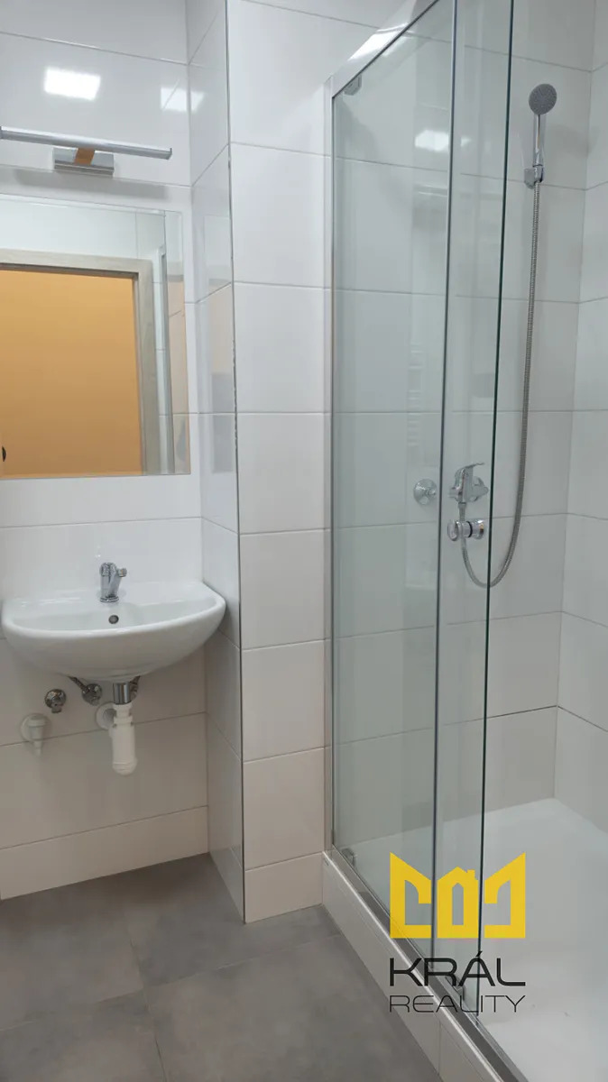 Koupelna se sprchovým koutem, WC, žebřinové topné těleso, umyvadlo, zabudované zrcadlo, elektrický boiler.