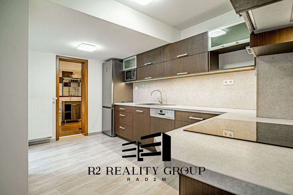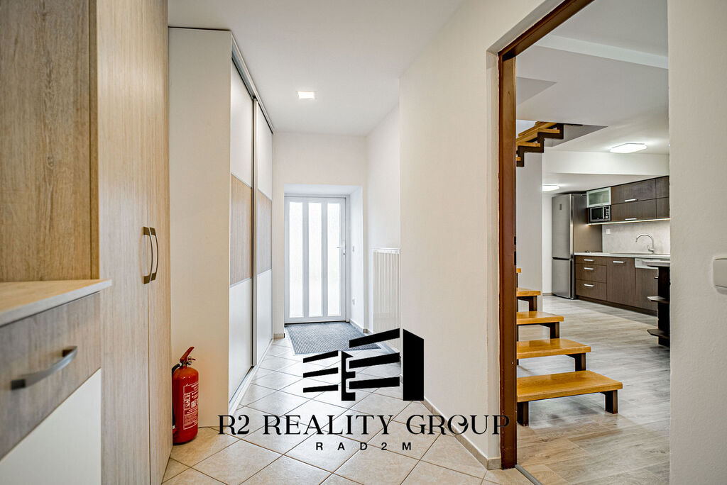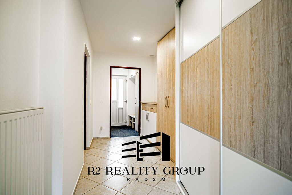 Přízemí: chodba ve, které jsou vestavěné skříně na míru, obývací pokoj s kuchyňským koutem, koupelna s vanou i sprchovým koutem, WC