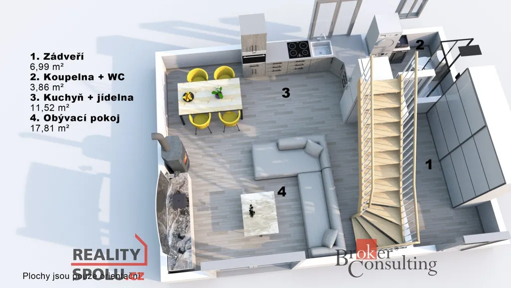 Vstupní chodba, koupelna s masážní sprchou a toaletou a prostorná kuchyň propojená s obývacím pokojem. Z obývací části vedou schody do patra / podkroví, zároveň je zde velké francouzské okno, kterým se vstupuje přímo na zastřešenou venkovní terasu s nádherným výhledem do přirody na koně a ovečky.