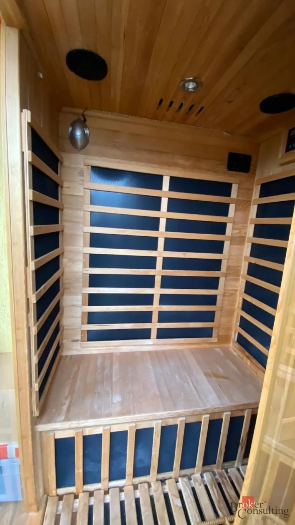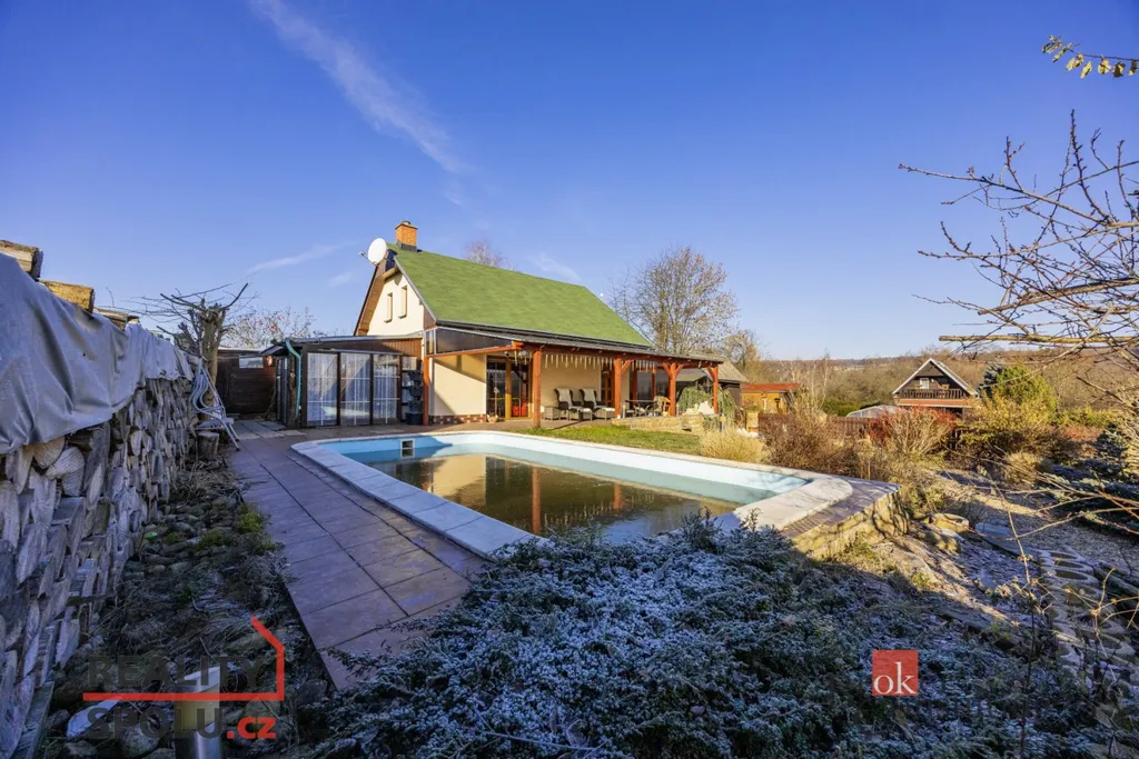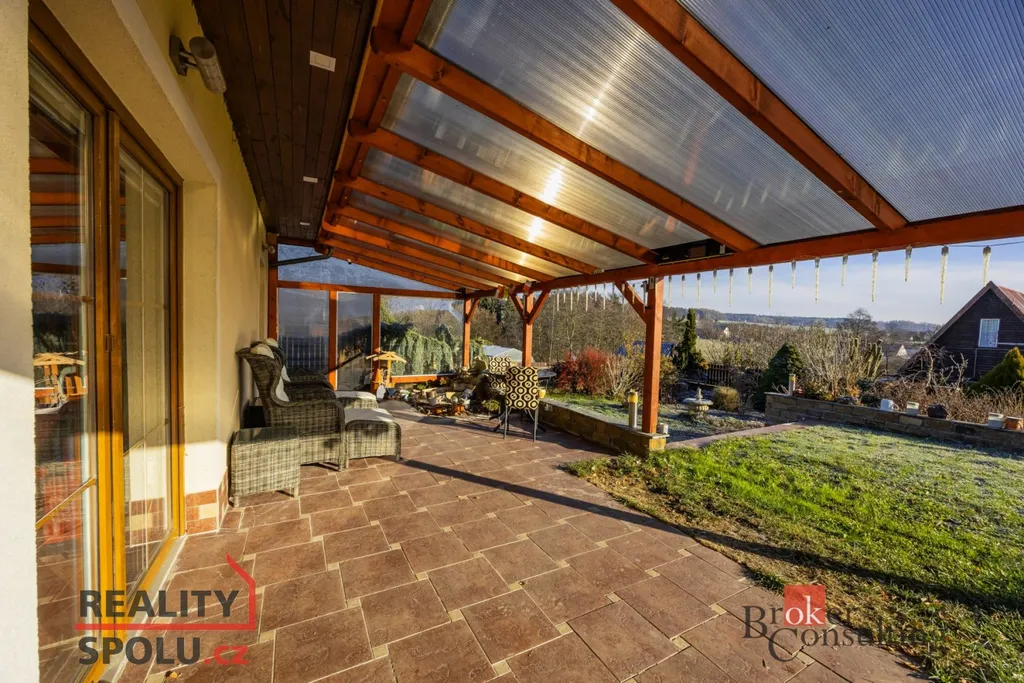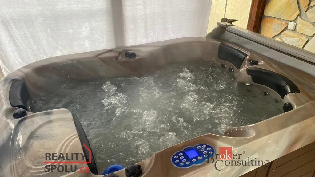 Součástí domu je již zmíněná zastřešená terasa, umožňující příjemné posezení i za horšího počasí. K domu je přistavěná také část s infrasaunou s přímým výhledem do přírody při saunování. Další místnost slouží jako zahradní veranda či párty místnost a je vybavena luxusní vířivkou. Zahrada je architektonicky navržená a členitě řešená, s dekorativními zákoutími, příjemným osvětlením i ozvučením pro večerní atmosféru. Dominantou celého venkovního prostoru je velký bazén. Nedílnou součástí je také samostatná dílna, ideální místo pro kutily, hobby práce, domácí projekty nebo bezpečné uložení nářadí.