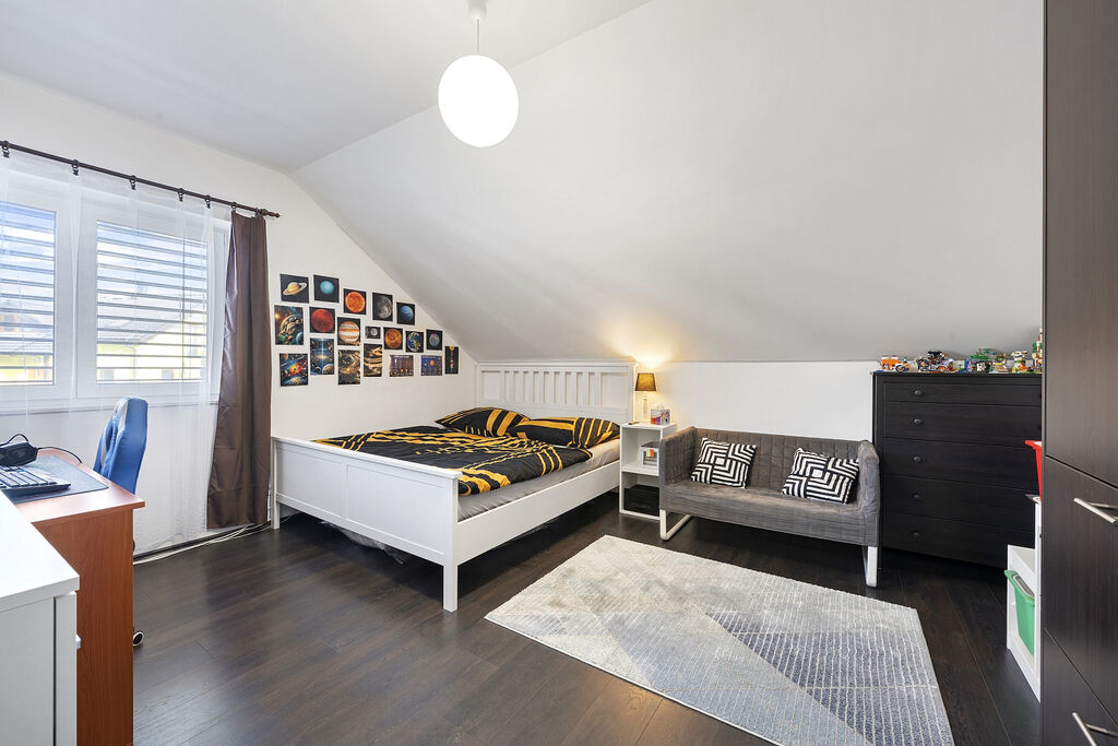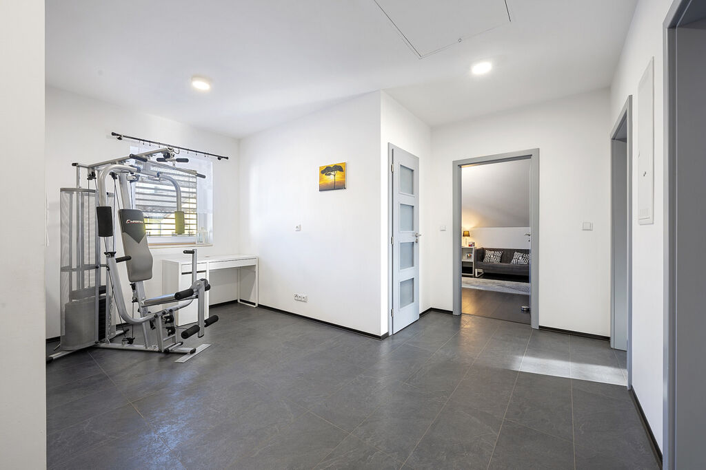 chodba, ze které je vstup do 3 samostatných pokojů, koupelna s WC a půda, která je připravená pro vybudování dalšího pokoje.
