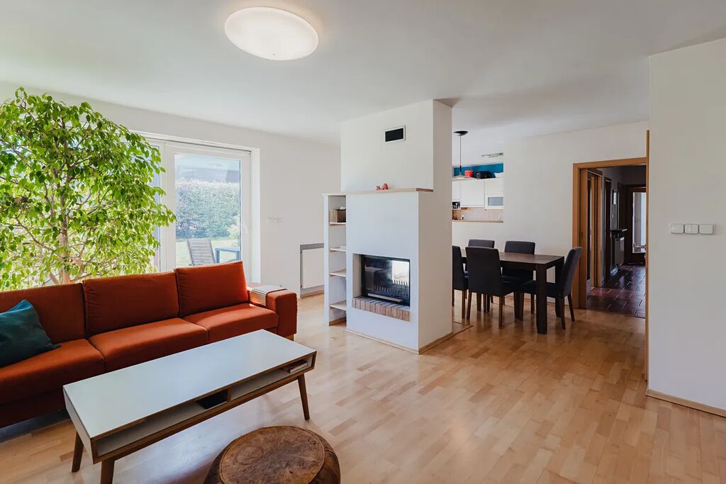 • Přízemí: světlý obývací pokoj s krbem a přímým vstupem na venkovní terasu s posezením, jídelna propojená s plně vybavenou kuchyní, pokoj (vhodný např. jako pokoj pro hosty nebo pracovna), koupelna s kuchyňským koutem, technická místnost a garáž pro dvě auta.