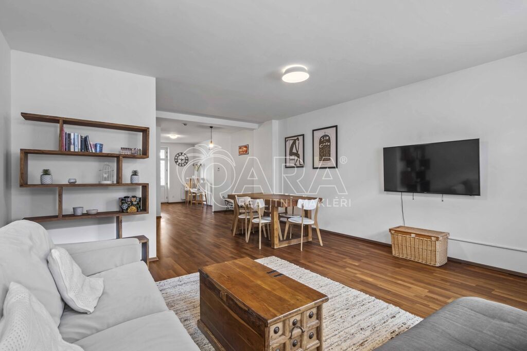 Obývací pokoj s kuchyňským koutem je vybaven kuchyňskou linkou v bílé barvě s kompletní sadou spotřebičů (sklokeramická deska, horkovzdušná trouba, mikrovlnná trouba, myčka nádobí, lednice s mrazákem, digestoř), barovým stolkem se dvěma barovými židlemi, dvoudílnou sedačkou, jídelním stolem pro 6 osob, velkou nástěnnou TV, konferenčním stolkem a dřevěnou knihovnou. Okna z obývacího pokoje směřují na jih do ulice Švandova, s výhledem směrem k řece.