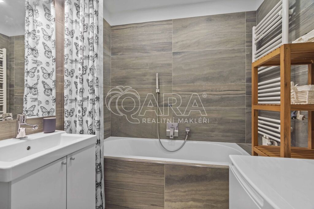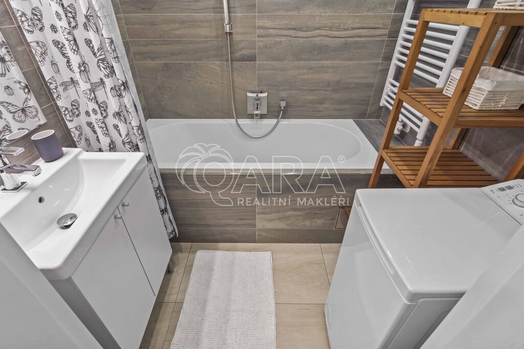 V koupelně je podlahové vytápění, vana, umyvadlo se zrcadlem, skříňka pod umyvadlem, pračka s horním plněním a dřevěná polička na kosmetiku. WC je samostatné.