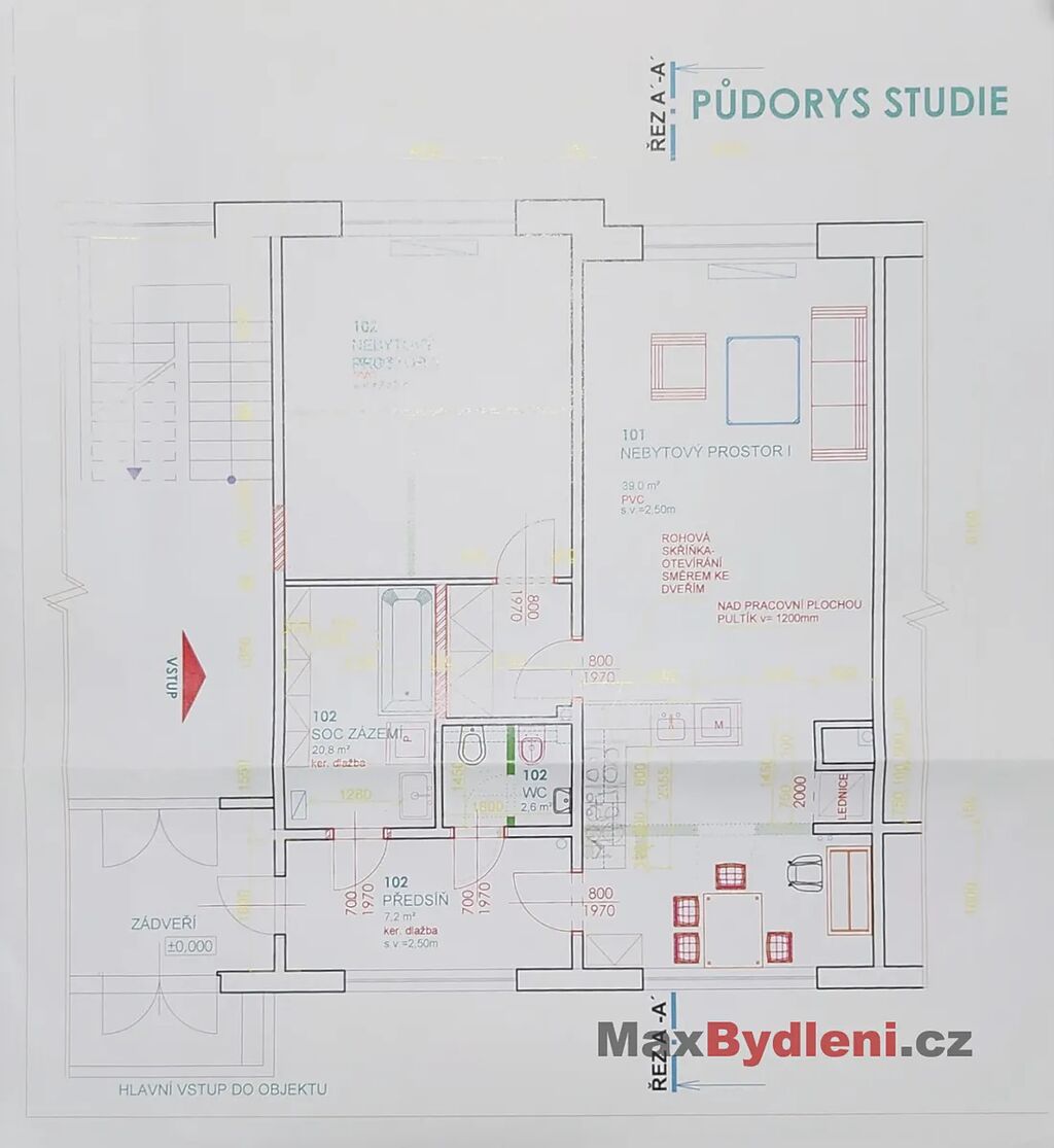Hlavní obytná místnost o rozloze 40 m² nabízí díky své velikosti možnost jednoduchého rozdělení na dva plnohodnotné pokoje. Okna obývacího pokoje i ložnice jsou orientována na jih, což zajišťuje dostatek denního světla.