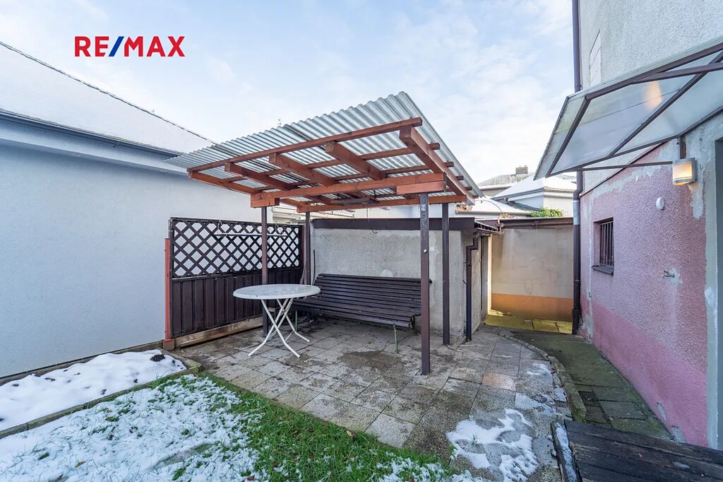 Soukromý koutek s dřevěným přístřeškem je ideální pro posezení s rodinou, grilování i odpočinek po práci. Ocení ho každý, kdo miluje květiny a vlastní kus zeleně přímo u domu.