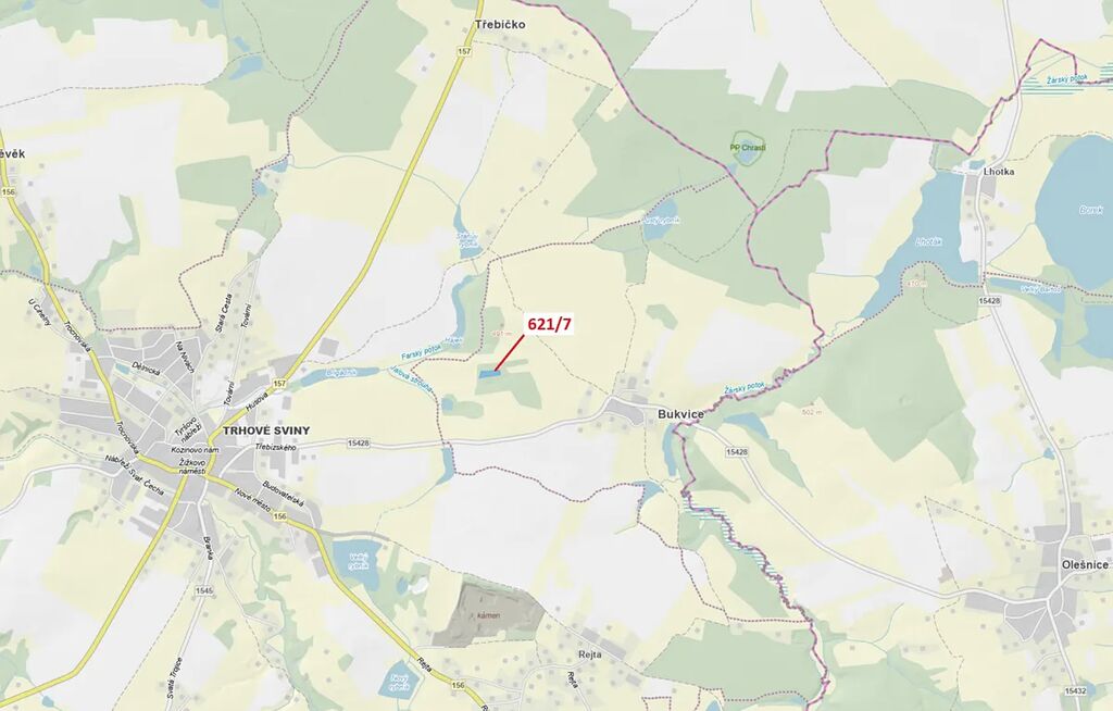Lesní pozemek o výměře 3603 m2, parcelní číslo 621/7, podíl 1/1, katastrální území Bukvice u Trhových Svinů, obec Trhové Sviny, obec s rozšířenou působností Trhové Sviny, okres České Budějovice, Jihočeský kraj. Po těžbě.