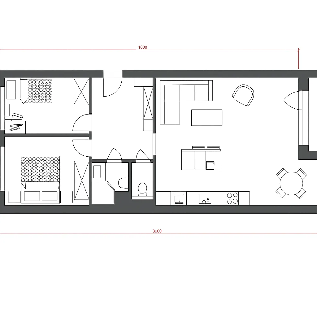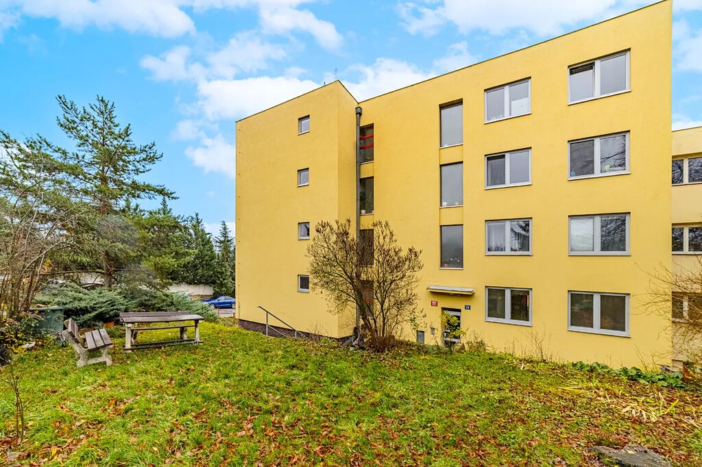 Dispozice bytu je velmi praktická – prostorný obývací pokoj s kuchyňským koutem, dvě samostatné ložnice, koupelna a oddělená toaleta. Díky umístění ve vyvýšeném přízemí je byt snadno přístupný a zároveň poskytuje dostatek soukromí.