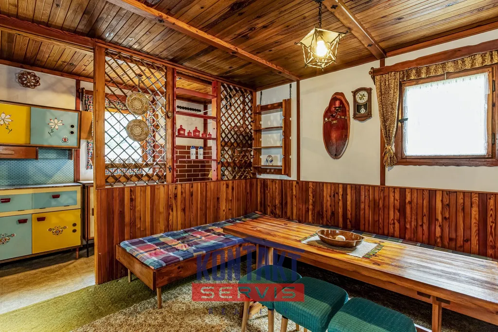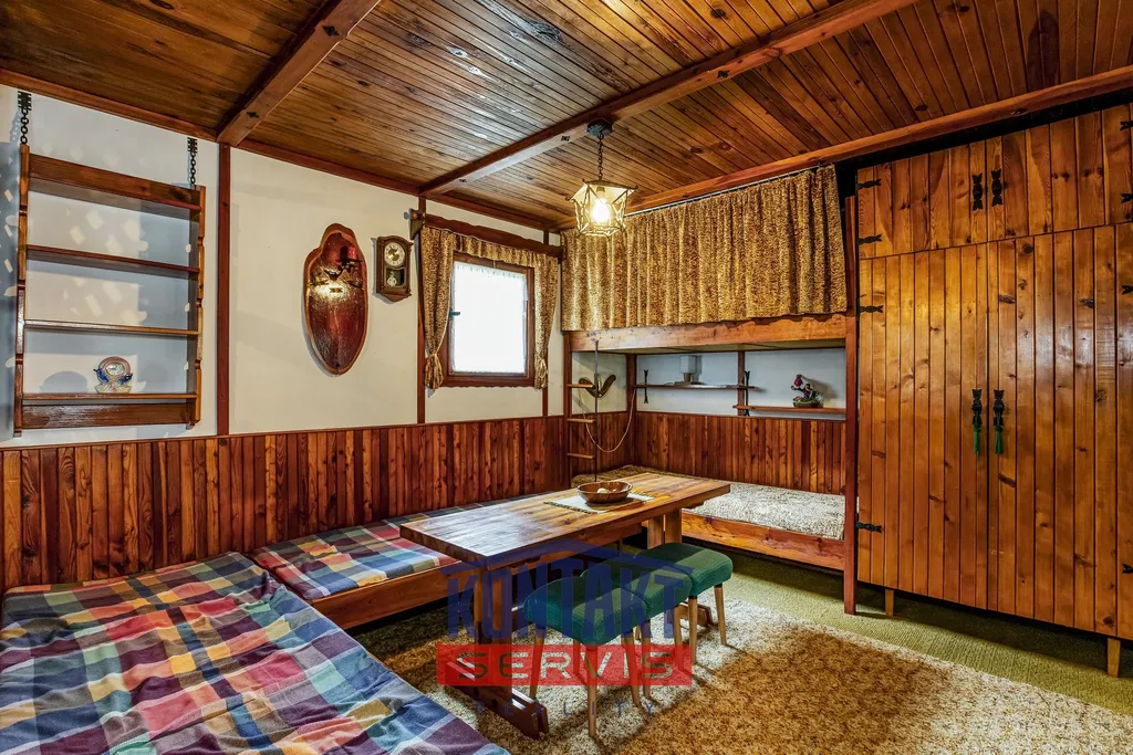 Interiér je laděn v tradičním chatařském stylu — barevný, funkční a s duší, což ocení především příznivci klasické rekreační estetiky.