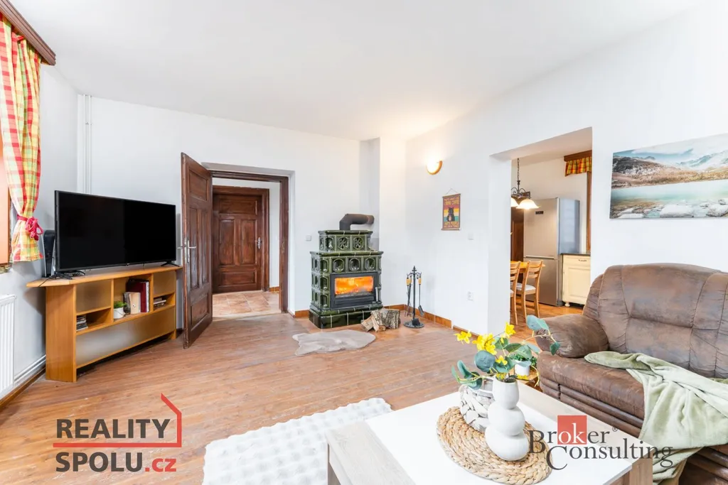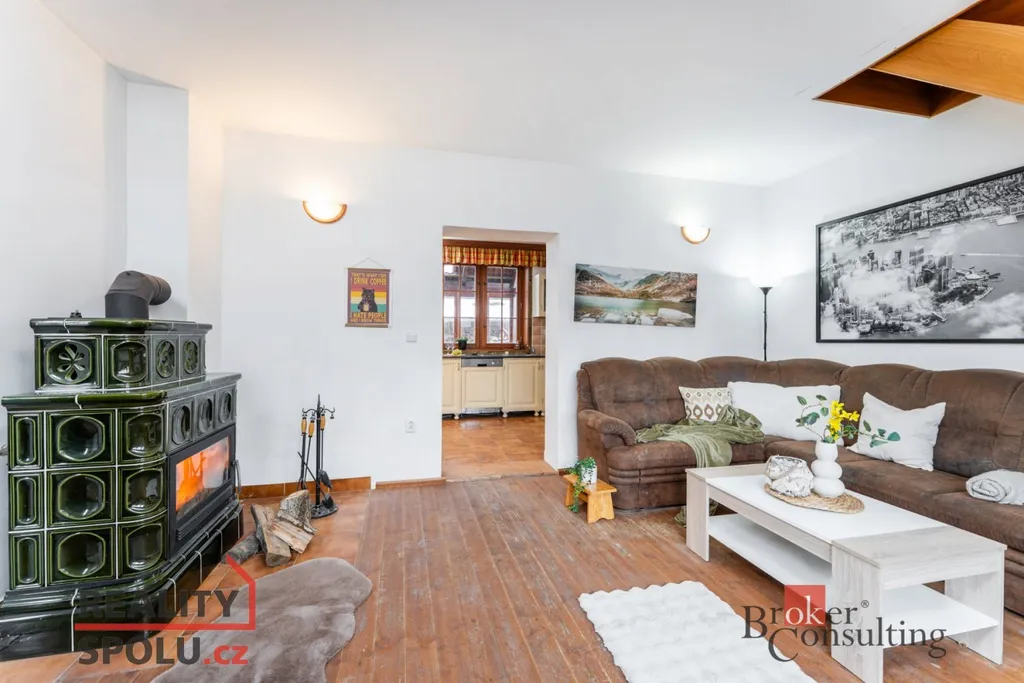 Vytápění je řešeno kachlovými kamny s výměníkem, které vytopí celý dům, a jako druhý zdroj slouží elektrické vytápění. Praktické, úsporné a flexibilní řešení. Dům je napojený na veřejnou kanalizaci i dálkový vodovod, což je velká výhoda – žádné starosti se septikem ani s vlastní vodárnou. Navíc se na pozemku nachází vlastní studna, která je sdílená se sousedy. Skvělá pro užitkovou vodu, zahradu nebo jako záložní zdroj. Součástí domu je také podlahové topení, které zajišťuje příjemný tepelný komfort.