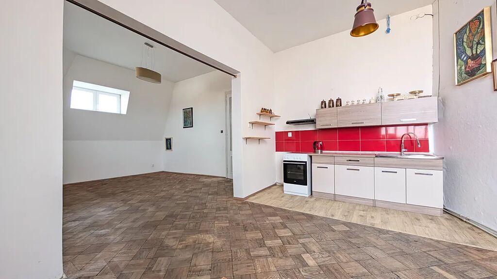 Byt se nachází v 5. patře udržovaného domu a nabízí příjemnou atmosféru s charakterem původního podkroví. Dispozici tvoří: