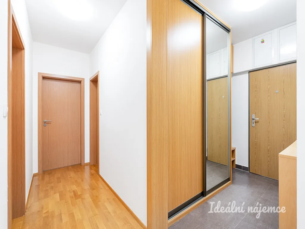 Byt se nabízí částečně vybavený. V obývací části je k dispozici sedací souprava. Kuchyně je vybavena lednicí, myčkou, elektrickou troubou, varnou deskou a digestoří. V prostorné koupelně je sprchový kout, umyvadlo a toaleta. V ložnici, pokoji i na chodbě se nachází vestavěná skříň.