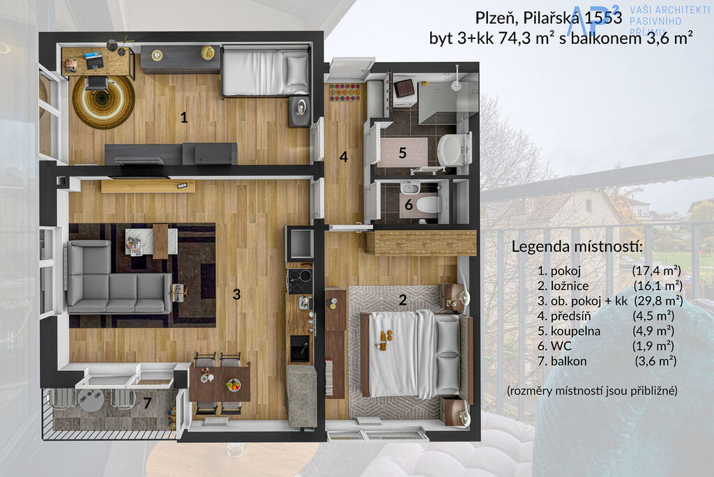 Nabízíme k dlouhodobému pronájmu byt 3+kk o rozloze 74,3 m² s balkónem 3,6 m² v ulici Pilařská 1553/1, Plzeň 4 – Doubravka ve 3. podlaží novostavby domu s moderním výtahem.