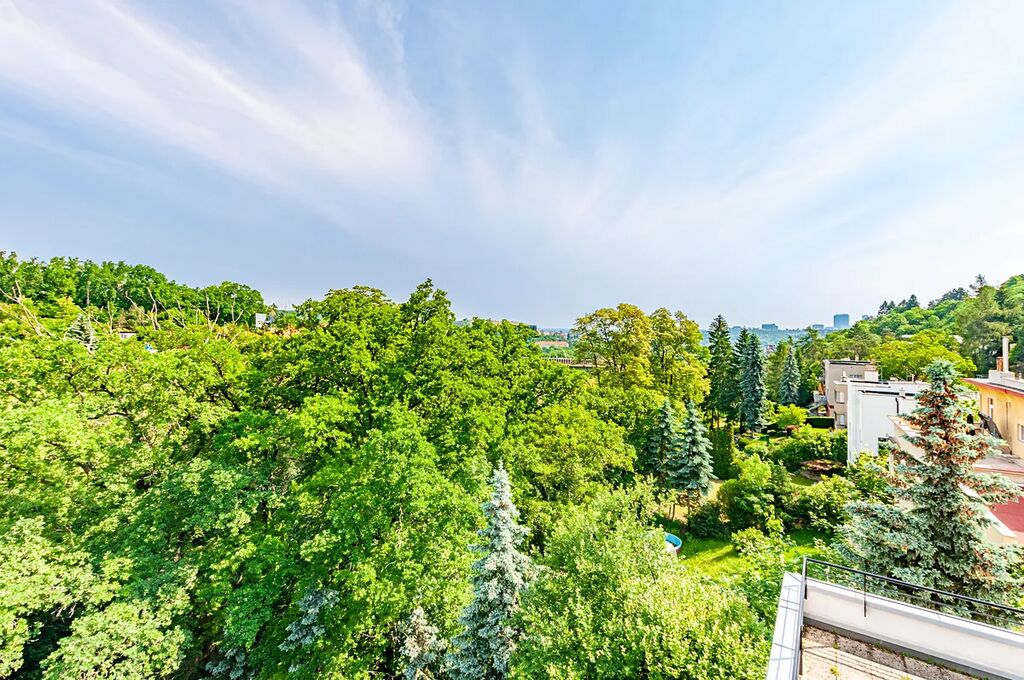 Krásně zrekonstruovaný byt o celkové užitné ploše cca 240 m² (interiér 193,7 m² + terasa 38 m² + sklep 5,8 m²) se nachází ve vile se 12 jednotkami, výtahem a parkováním. Klidná slepá ulice přímo u lesa, jen 10 minut od centra Prahy.