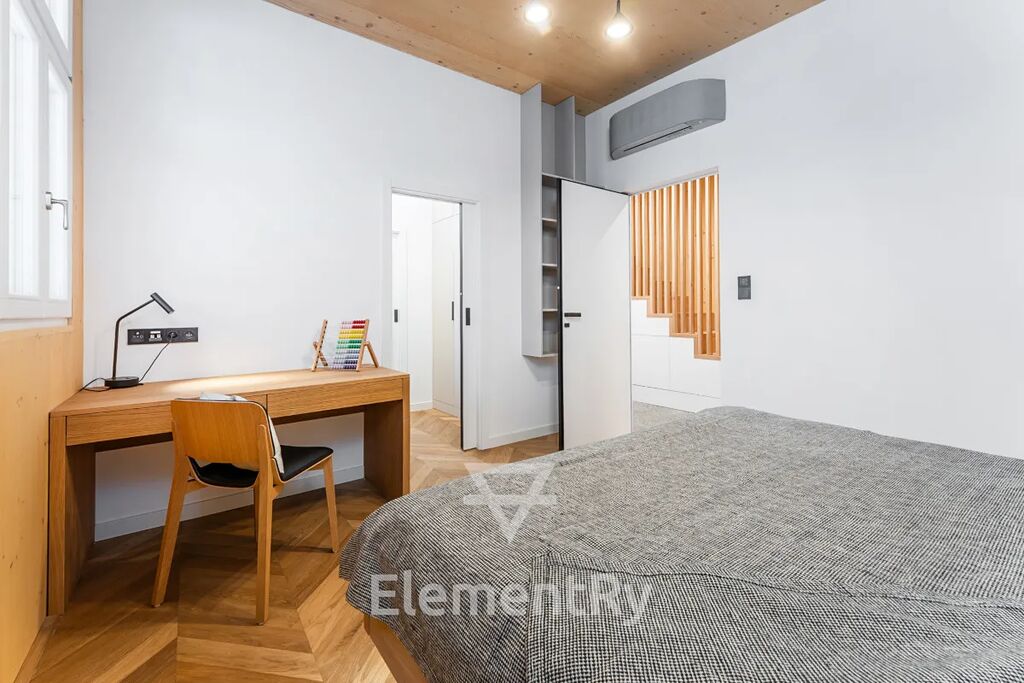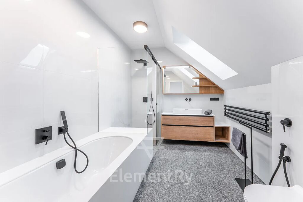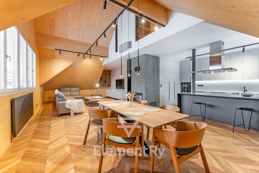 Celý byt je navržen v nadčasovém designu s použitím prémiových materiálů a poskytuje maximální komfort pro náročné klienty, kteří hledají reprezentativní a zároveň praktické bydlení.