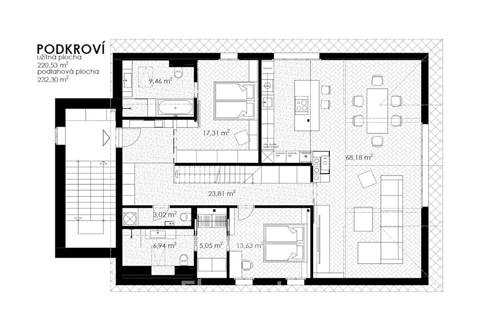 - designový nábytek na míru a dostatek úložných prostor