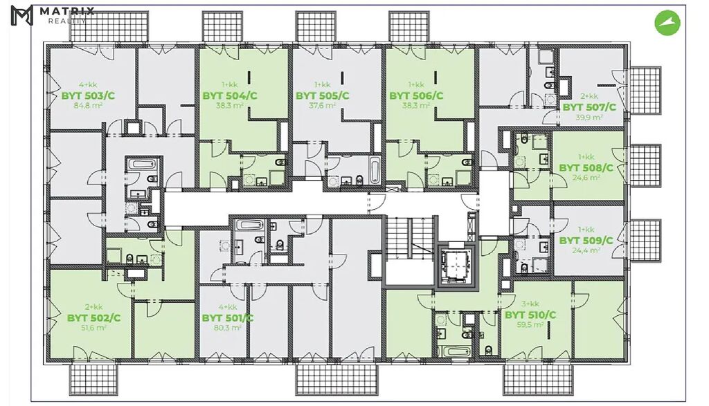 Tento byt 1+kk o 38,3 m s balkonem 3,8 m. Lze realizovat dispoziční úprava na 2+kk se zachováním dostatečného prostoru.