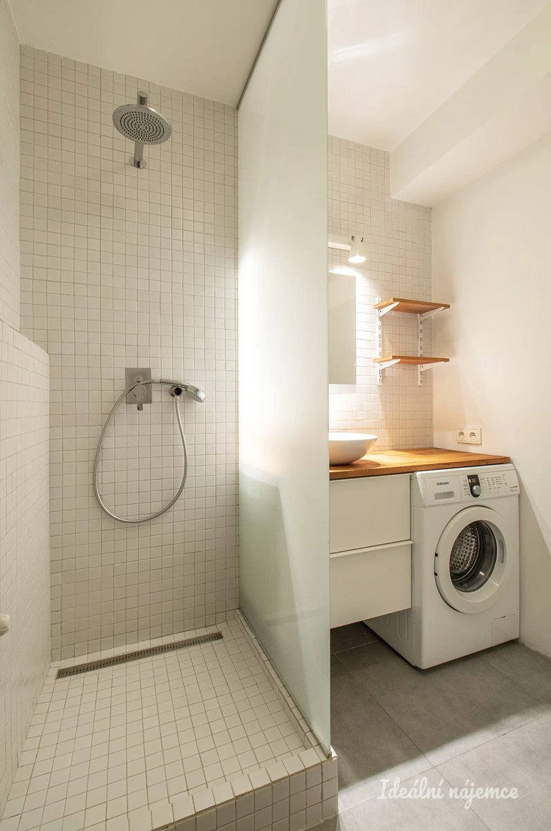 Nabízí se částečně vybavený. V praktické kuchyňské části nalezneme vestavěné spotřebiče - ledničku, elektrickou troubu, myčku, sklokeramickou varnou desku a digestoř. Obývací část disponuje sedačkou a jídelním stolem s židlemi. V ložnici se nachází manželsk postel, stůl a prostorná skříň. V koupelně se nachází pračka, sprchový kout a toaleta.