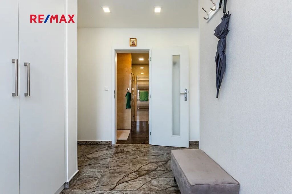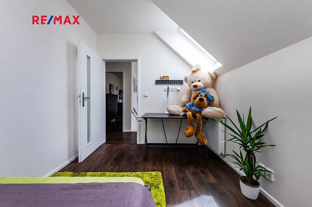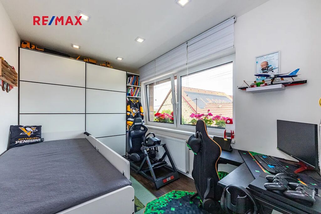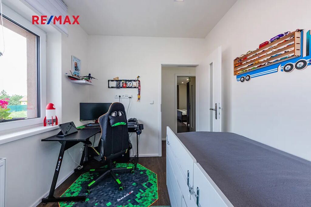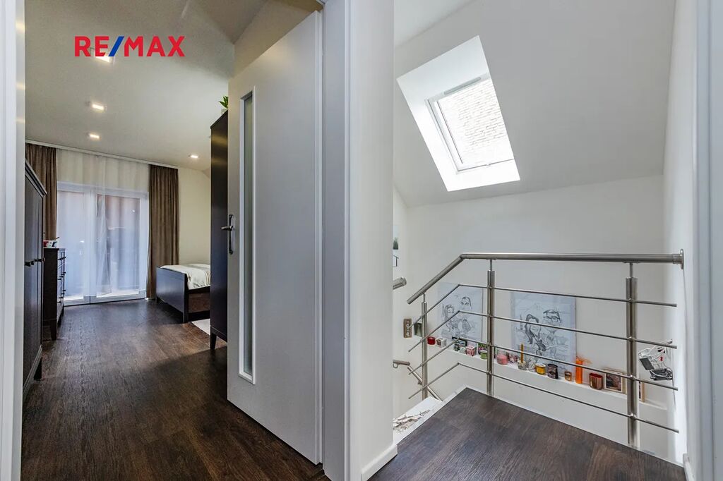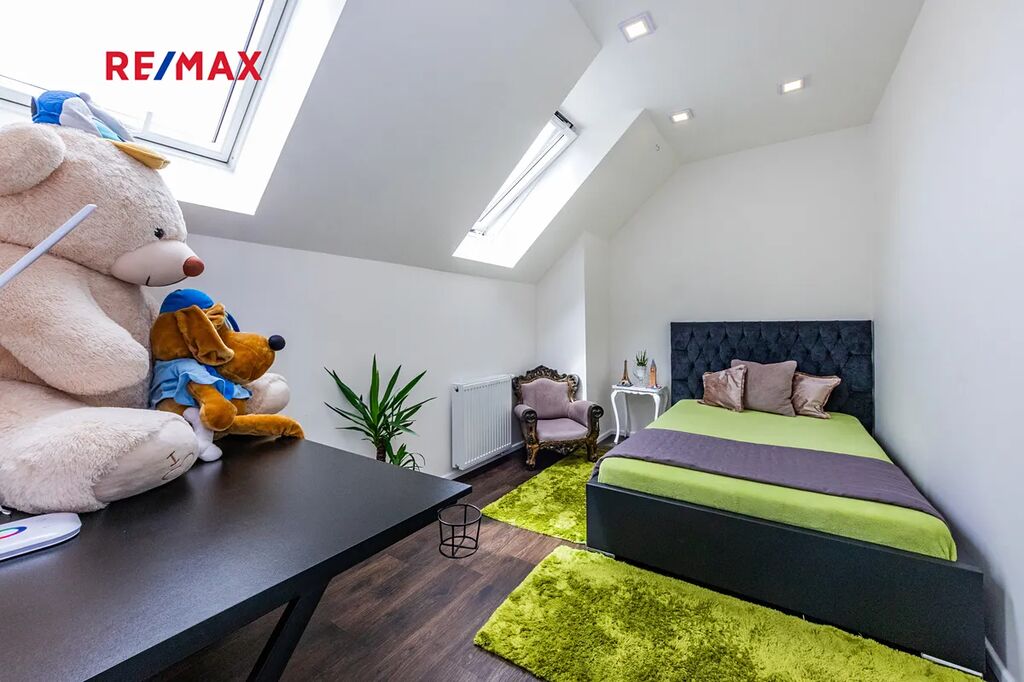 V patře domu se nachází klidová zóna. Jsou zde dva menší pokoje, ideální jako dětské ložnice, pracovna nebo pokoj pro hosty. Dále šatna a velkorysá hlavní ložnice, která poskytuje dostatek prostoru a pohodlí. Součástí této ložnice je vlastní koupelna, která zajišťuje naprosté soukromí a komfort. Z ložnice je zároveň přímý vstup na prostornou krytou terasu.