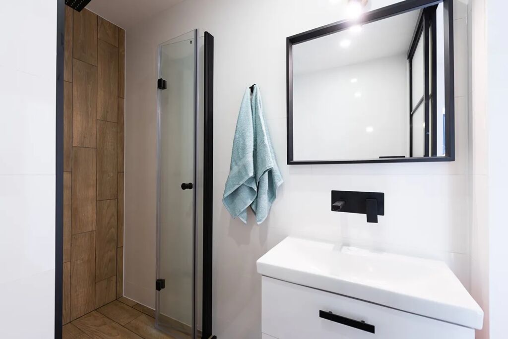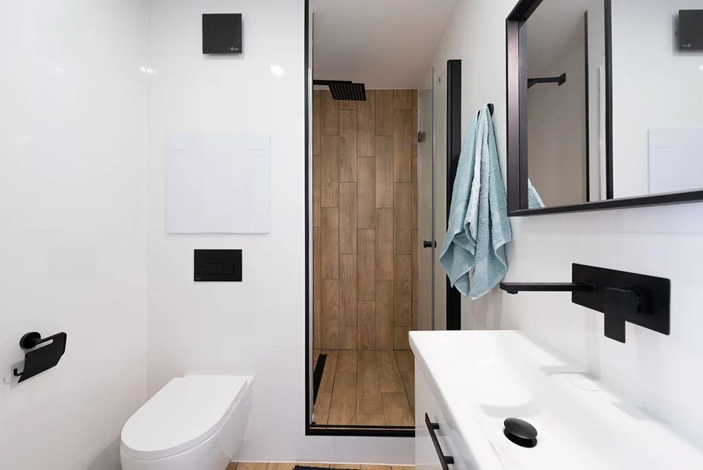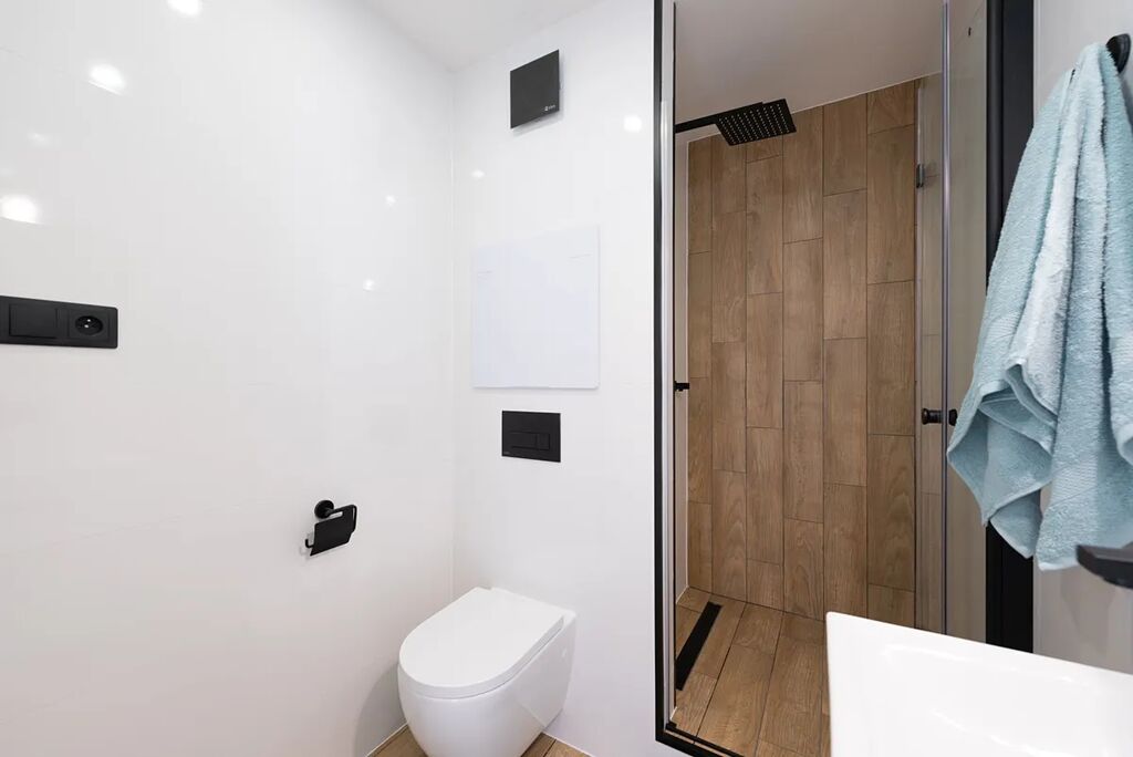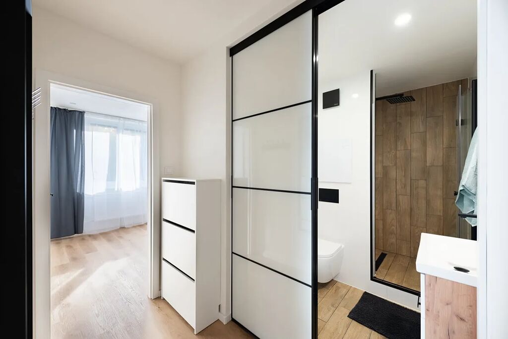 Moderní koupelna kombinuje jednoduchý design s kvalitními materiály – velkoformátové obklady, podlaha v imitaci dřeva, sprchový kout s dešťovou sprchou, podomítkové baterie a toaleta Geberit. Posuvné skleněné dveře šetří prostor a podtrhují čistý vzhled.