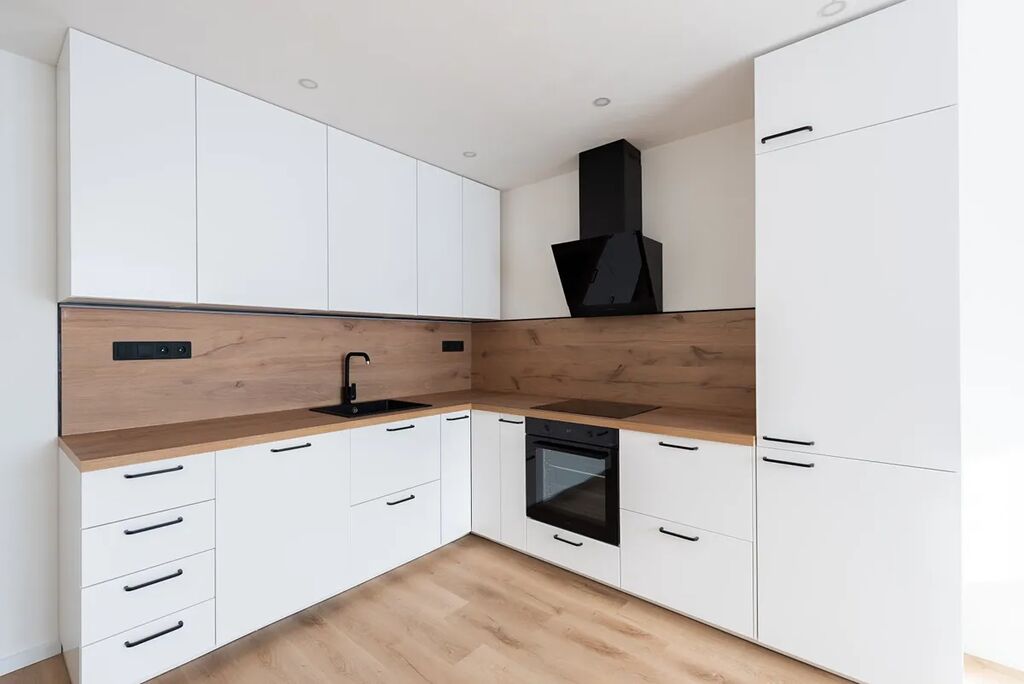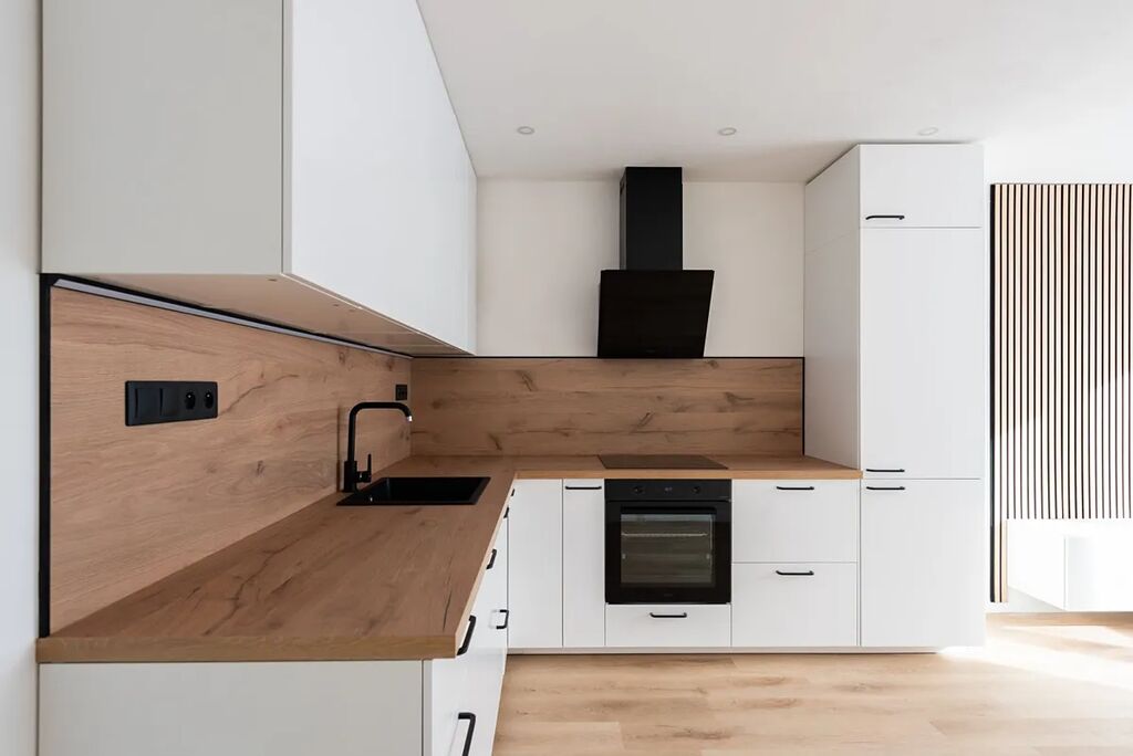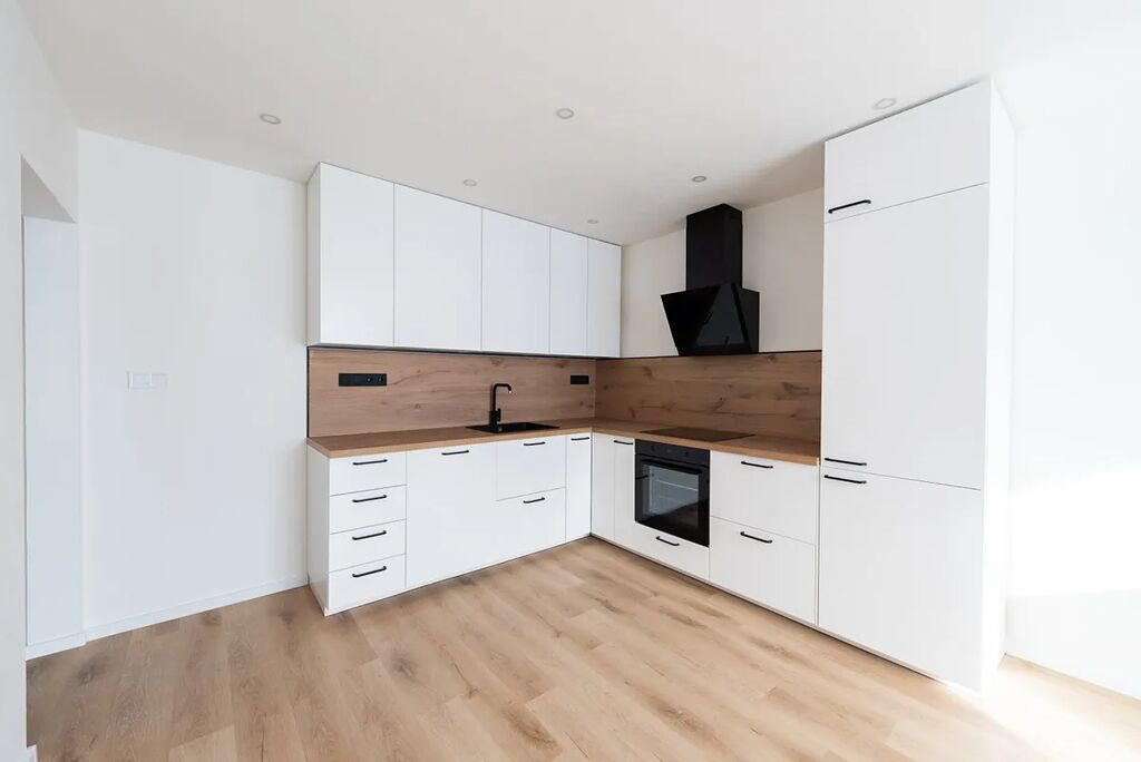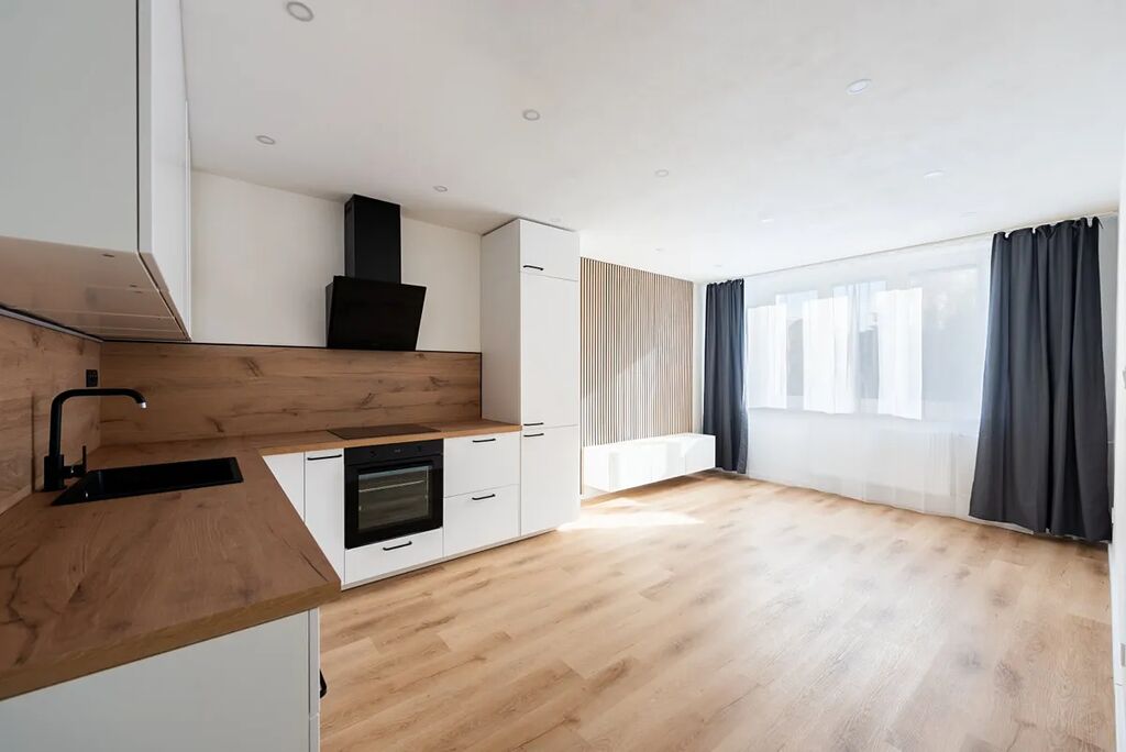 Srdcem bytu je obývací pokoj s novou kuchyňskou linkou v elegantní kombinaci světlého dřeva a bílých ploch. Kuchyně je plně vybavena vestavnými spotřebiči: troubou, indukční deskou, digestoří, myčkou i lednicí s mrazákem. Nechybí velkorysá pracovní deska ani dostatek úložných prostor.