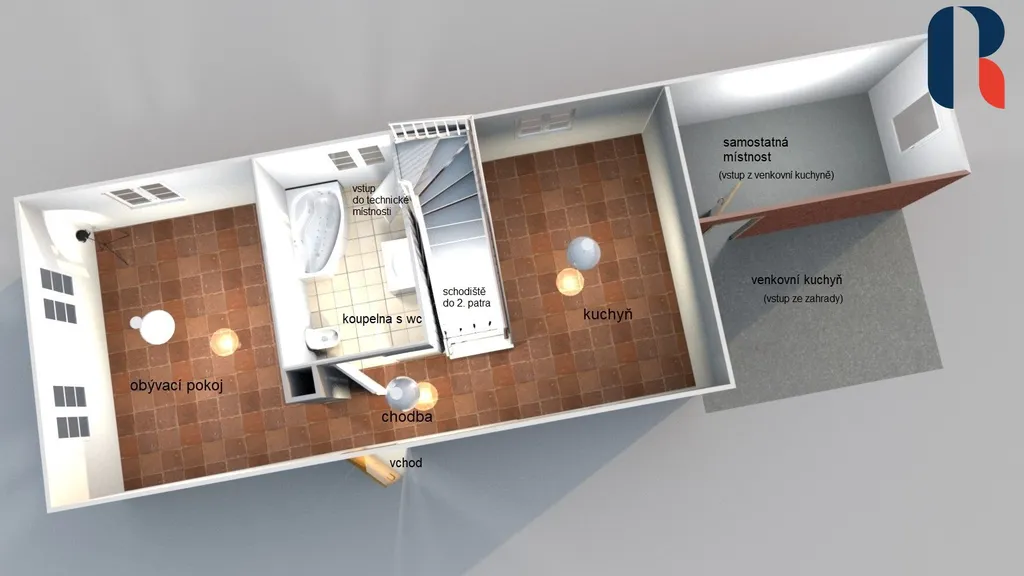 Patrový dům s podlahovou plochou 120 m² je dispozičně řešen jako 3+1. V dolním patře je chodba, obývací pokoj, kuchyň, technická místnost, koupelna s wc a vanou. V horním patře nad schodištěm se nachází chodba, wc, dva samostatné pokoje a šatna.