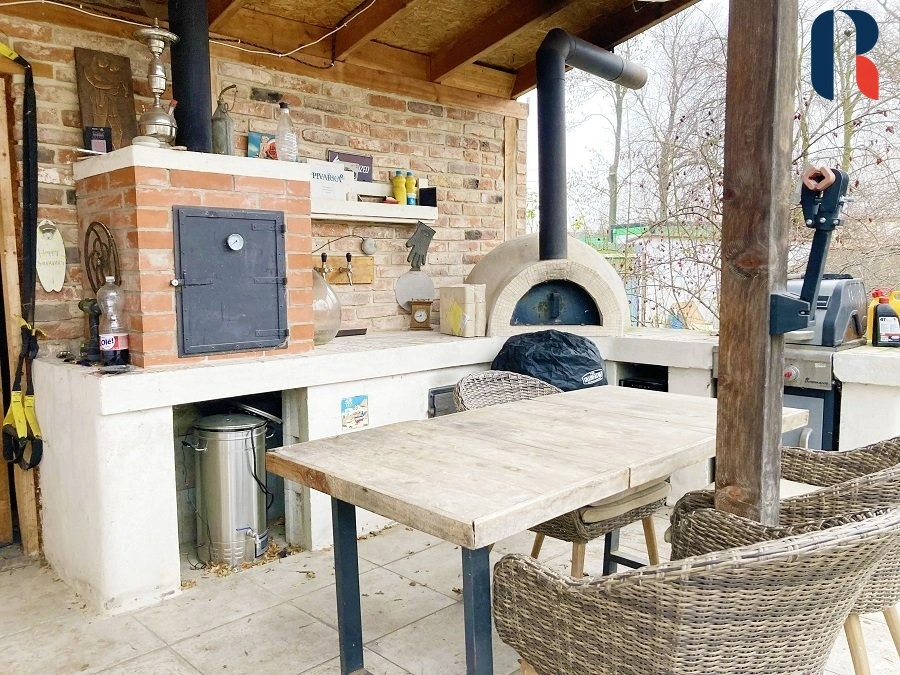 Na dům navazuje venkovní kuchyň se sporákem ( propan butan), pecí, udírnou, grilem, dřezem a úložnými prostory. Z venkovní kuchyně je vstup do samostatné místnosti, kterou lze využít k jakémukoliv účelu ( aktuálně tělocvična se saunou). Zahrada je rovinatá se vzrostlými stromy ( jabloně, broskev, mandloň, vrby aj.), ovocnými keři a je ideálním místem pro klidné venkovní posezení. Nachází se zde krytý uzamykatelný přístavek, který může sloužit uvnitř jako úložný prostor zahradnických potřeb, dřeva, nářadí a z venkovní části jako kryté venkovního posezení.