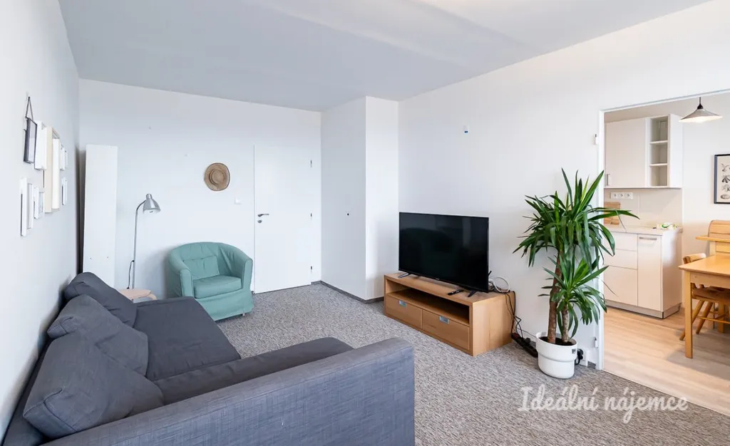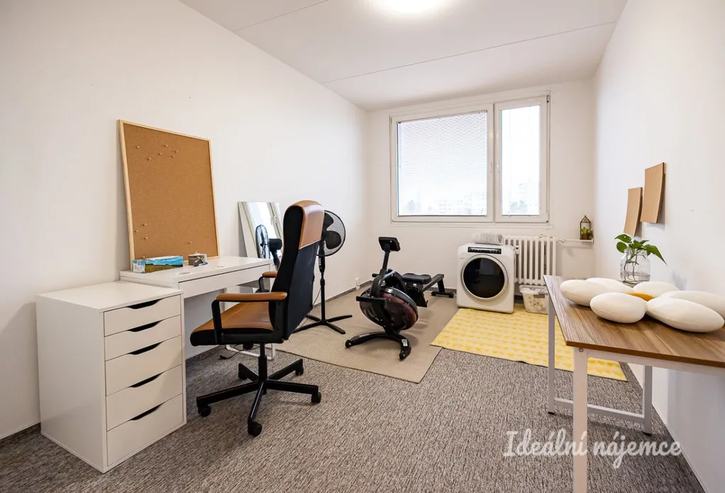 Nabízí se plně vybavený. Kuchyně disponuje lednicí, myčkou, elektrickou troubou, varnou deskou, mikrovlnnou troubou a digestoří a nabízí dostatek prostoru pro jídelní část se stolem a židlemi. V obývacím pokoji najdeme sedačku, křeslo, TV stolek a knihovnu. Součástí ložnice je manželská postel s nočními stolky a komoda s šatní skříní. V druhém pokoji najdeme dva pracovní stoly a fitness náčiní.