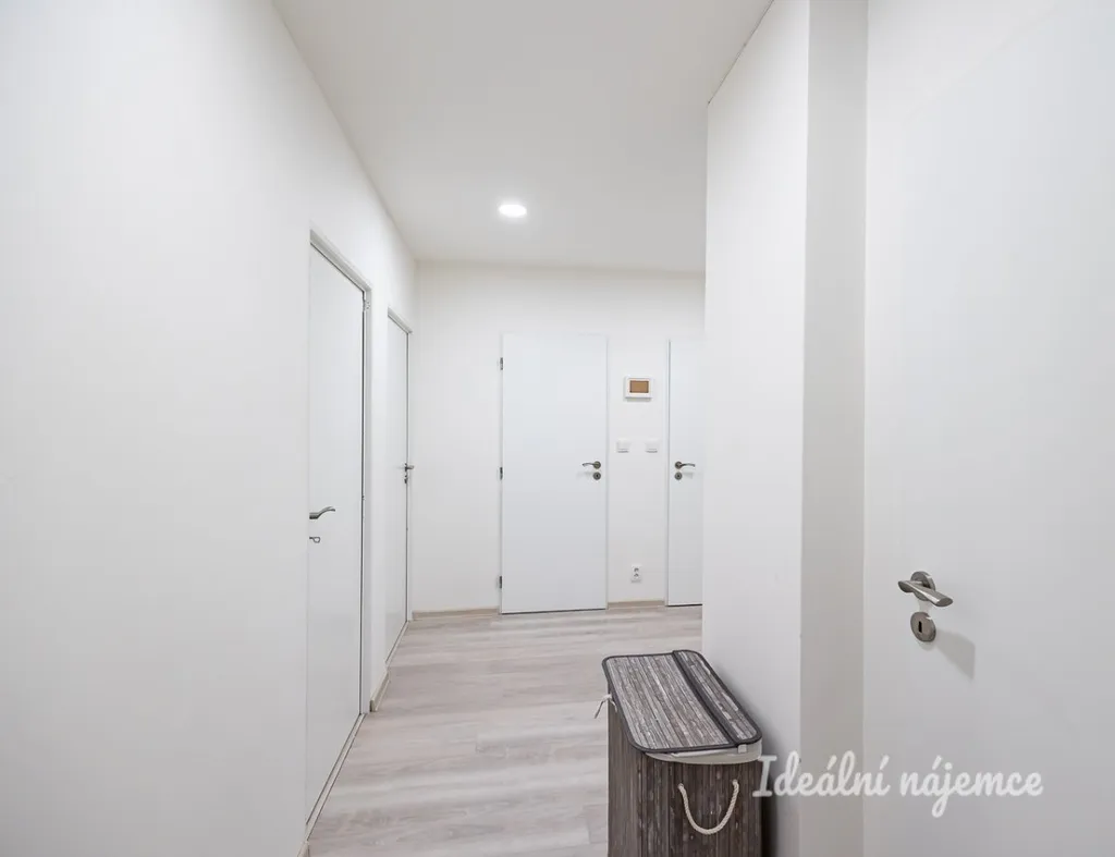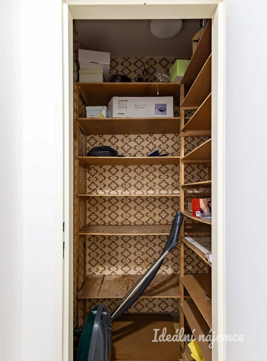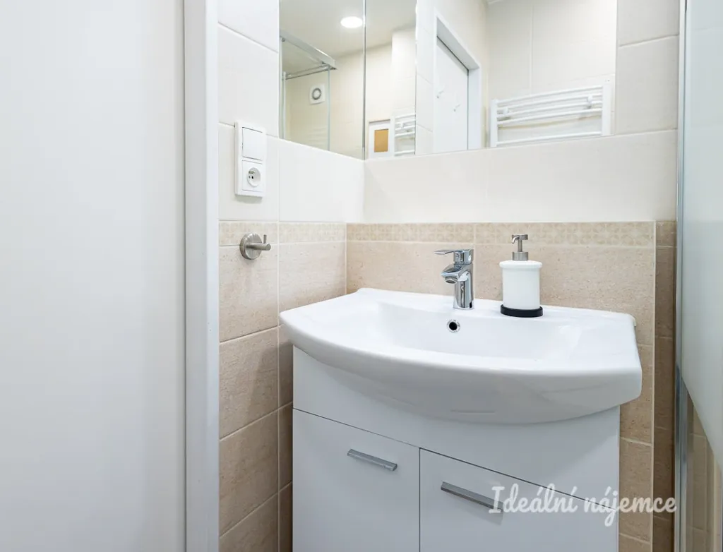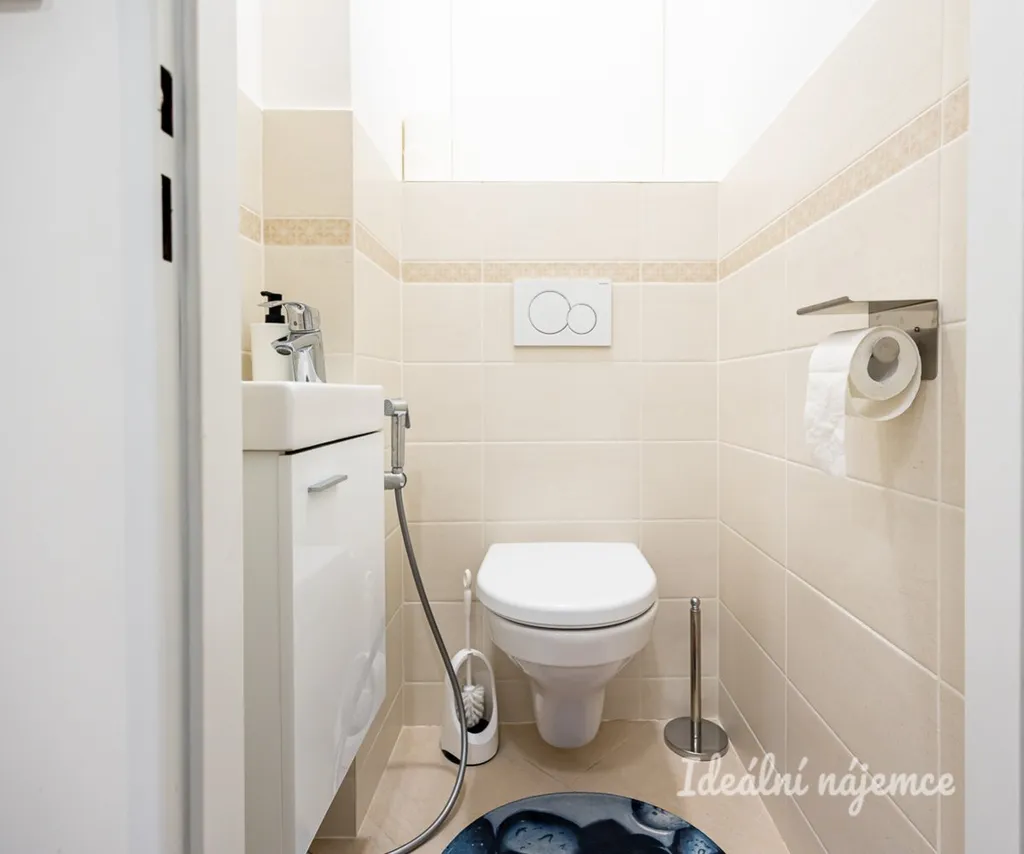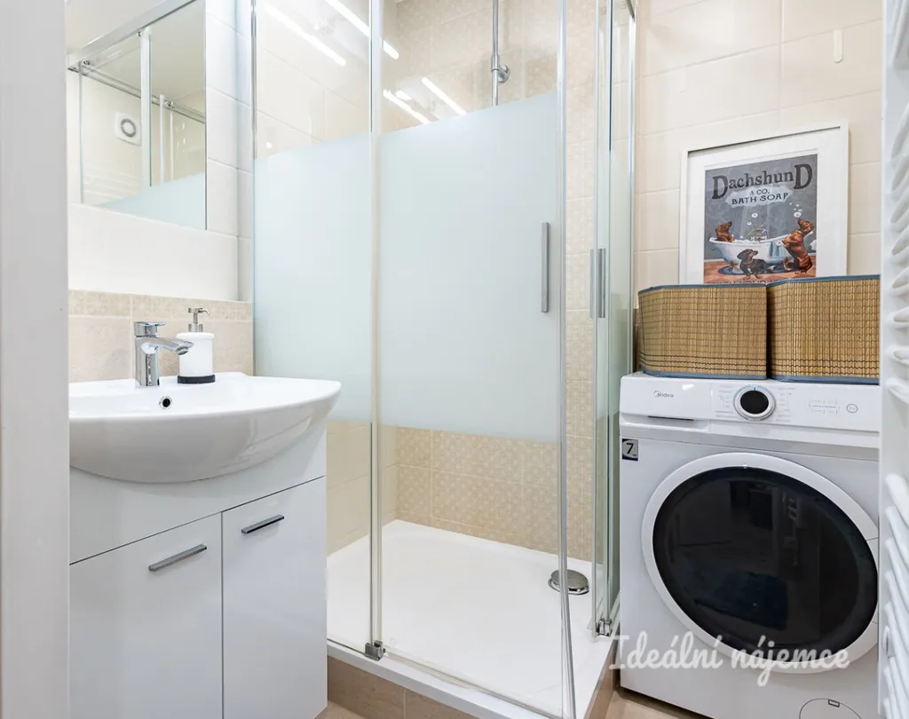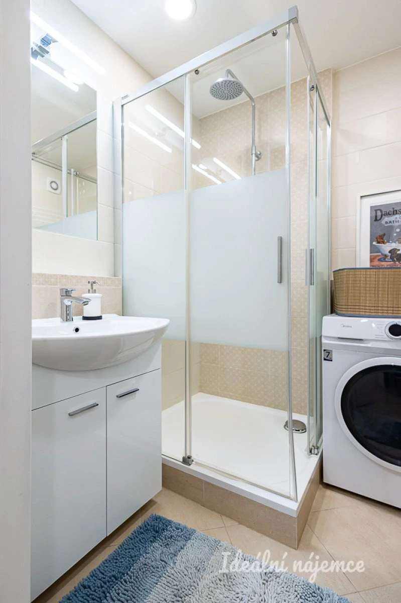 V koupelně se nachází sprchový kout, umyvadlo a pračku. Toaleta je umístěna samostatně. Výhodou bytu je dostatek úložných prostor - v předsíni se nacházejí dvě komory.