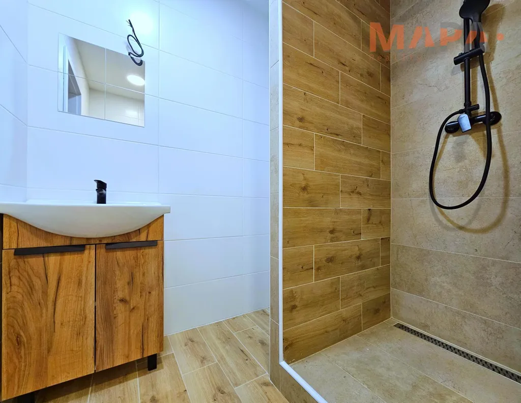 Součástí tohoto hezkého bytu po rekonstrukci je zděná koupelna se sprchovým koutem, WC a kuchyňská linka.