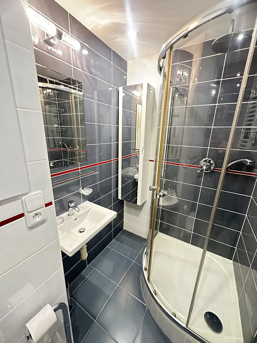 koupelna s WC, vybavená sprchovým koutem, pračkou, umyvadlem se zrcadlovou skříňkou a úložnou skříňkou. K bytu dále náleží sklepní kóje o velikosti 2m2.