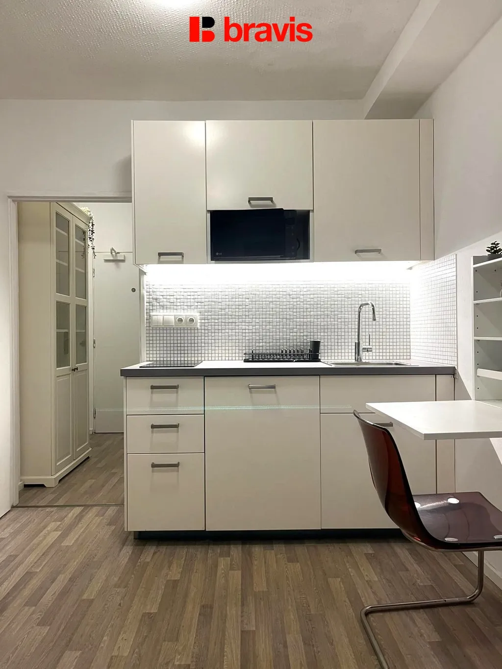 Byt se nachází v suterénu a je částečně zařízen (kuchyňská linka na míru, sporák se sklokeramickou deskou, digestoř). Obývací část se nabízí bez vybavení.